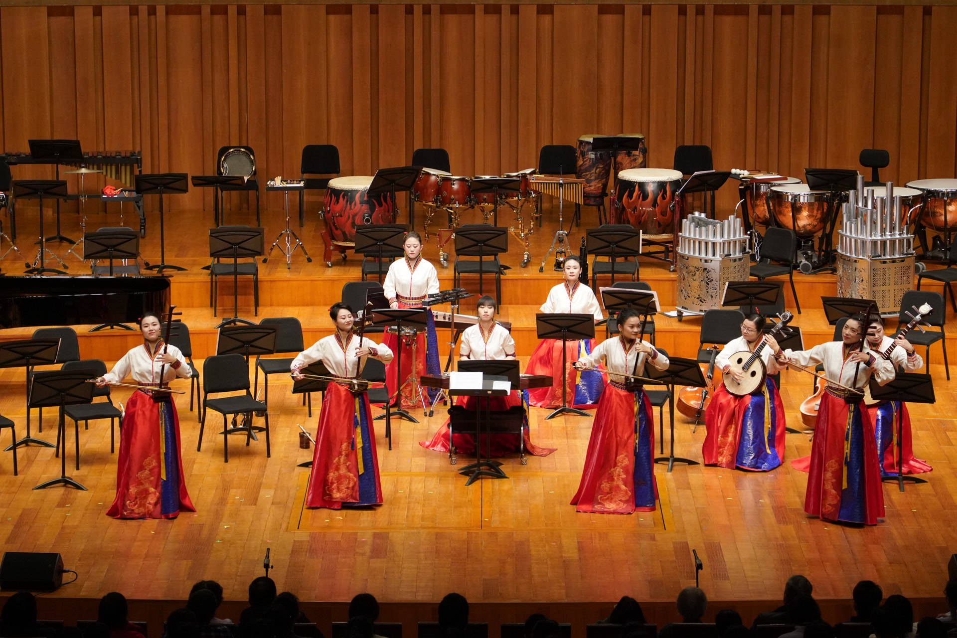 音乐会由指挥温锋超执棒,在《北京喜讯到边寨》欢快的旋律中拉开帷幕。演出现场,被誉为“东方小夜曲”的国家级非遗云南弥渡民歌代表性曲目《小河淌水》缓缓传来;《奔腾》则以昂扬旋律,展现出草原上群马奔腾的壮观景象;《生活美如霞》以清澈合唱演绎出壮族民歌的独特魅力;伽倻琴弹唱作为中央民族歌舞团经典保留节目,此次带来温润动听的《迎春谣》。