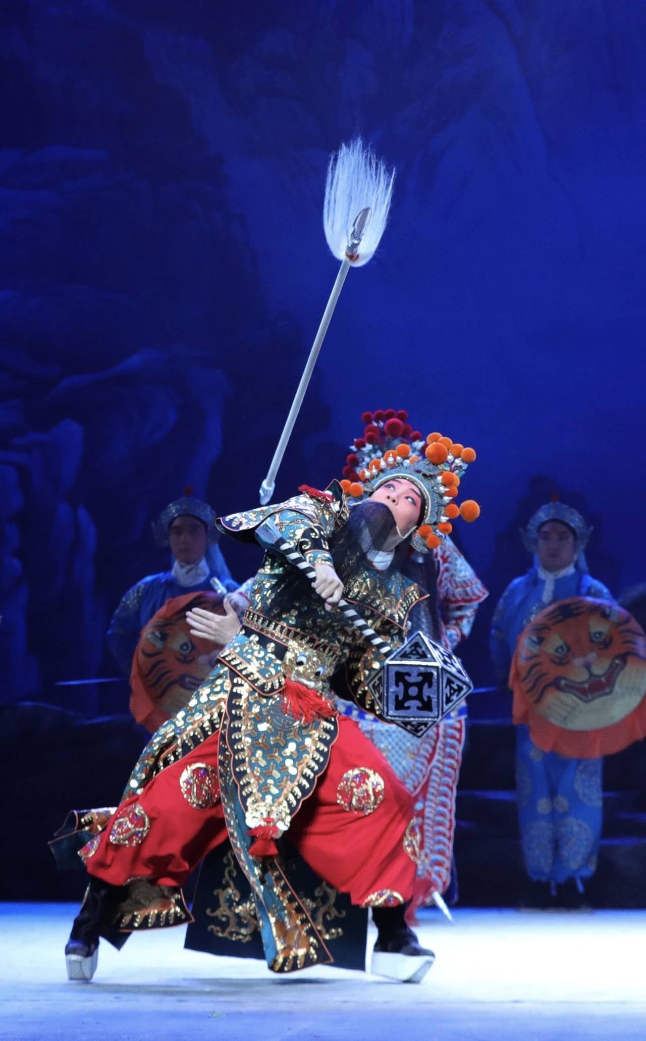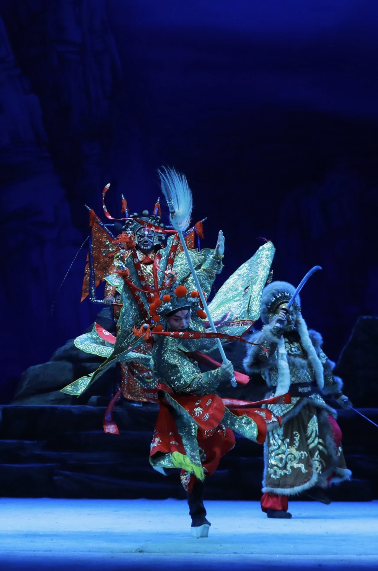 宋金两军迥然不同的练兵场景,慢动作处理的战场厮杀……舞台布景的立体灵动,灯光色彩的意境转换,音乐情绪的精准把控,为武戏上演构建了一个崭新的戏剧空间。