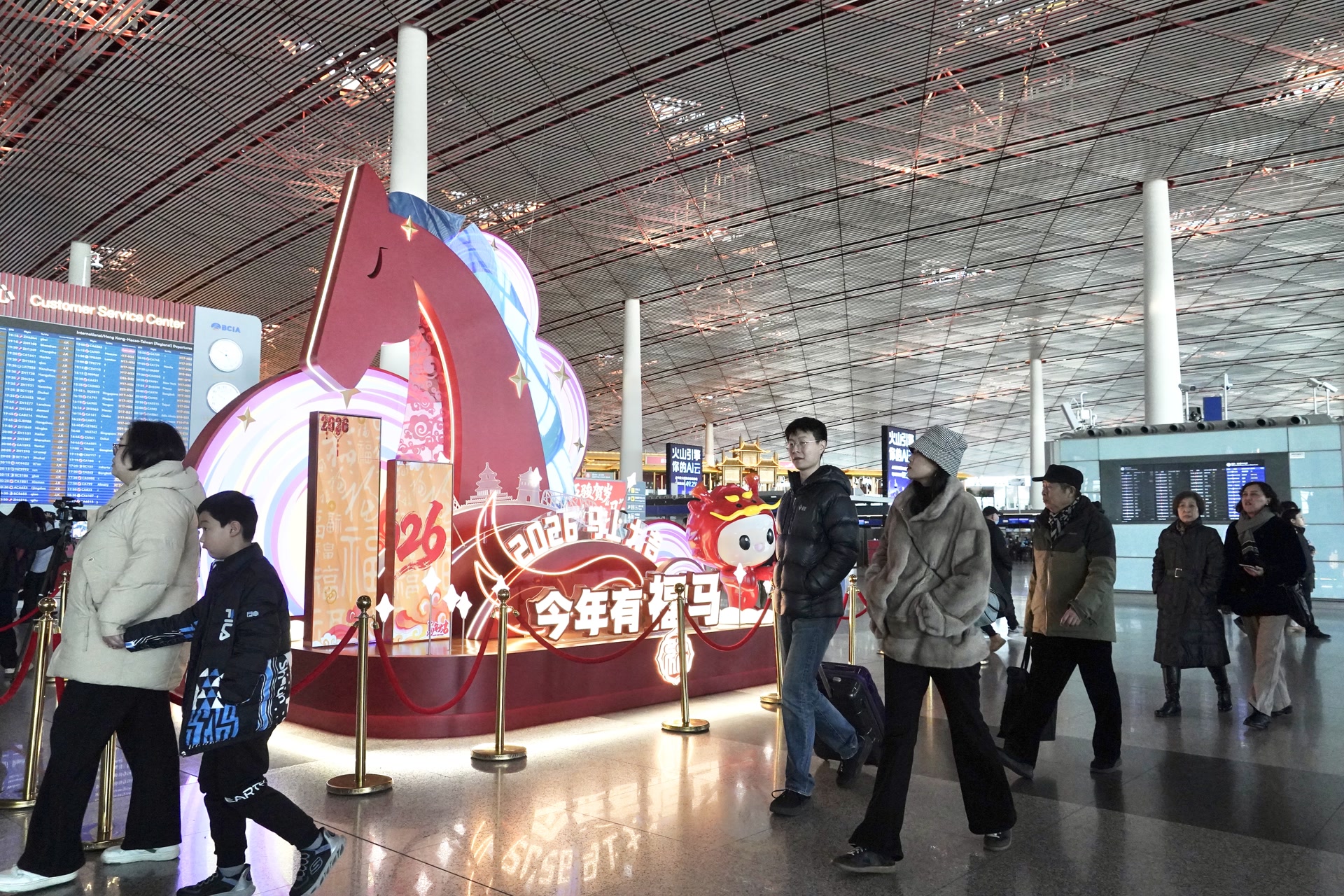 走进首都机场航站楼,航站楼精心设置的新春景观让节日氛围扑面而来。其中,3号航站楼的装饰以“天马”为主题,呼应汉代“天马为龙使”的文化内涵,象征机场连接世界;2号航站楼塑造“日历新篇”景观,融入剪纸风格马年图案与北京剪影,寓意新年启程、时光焕新。