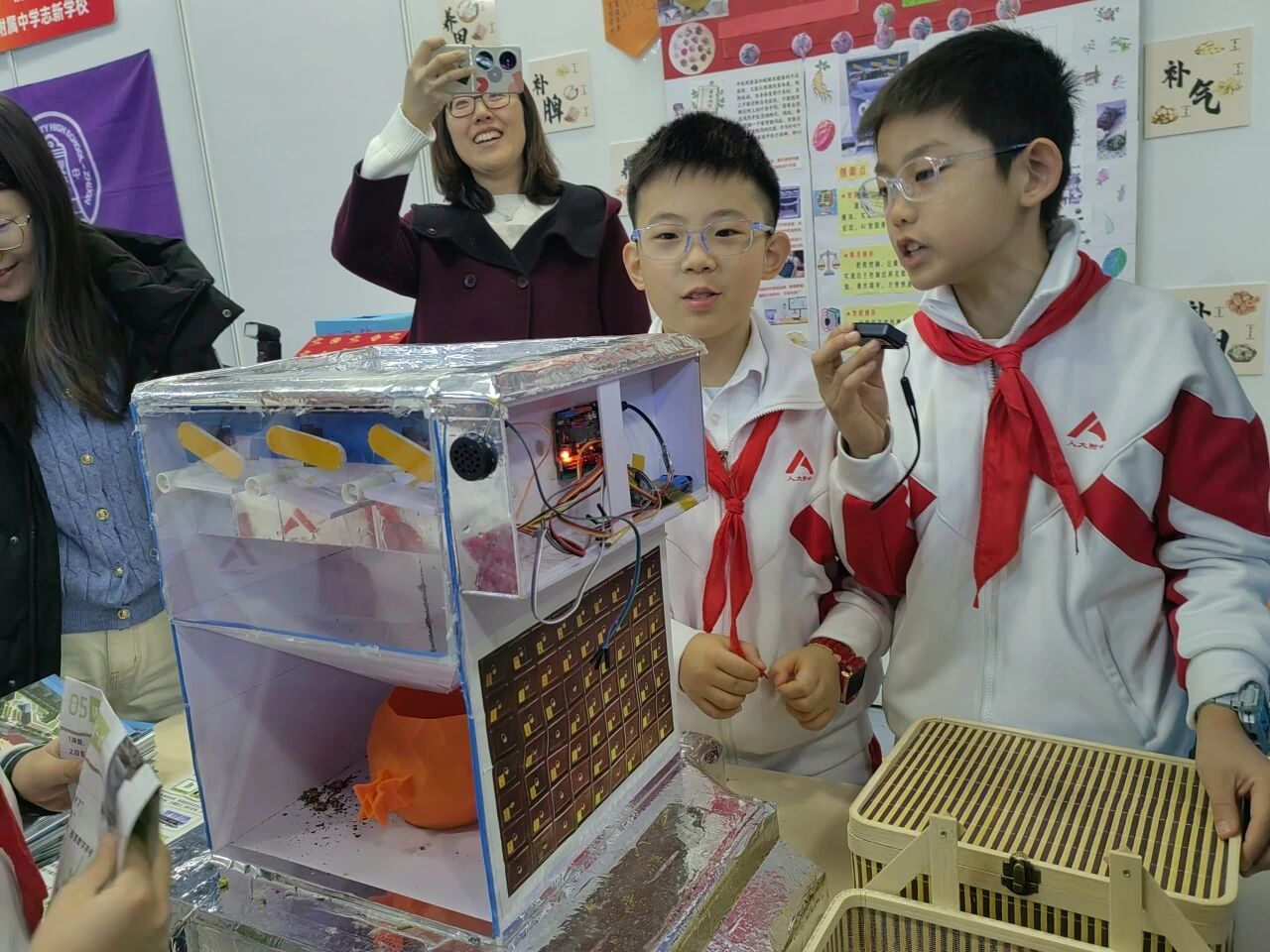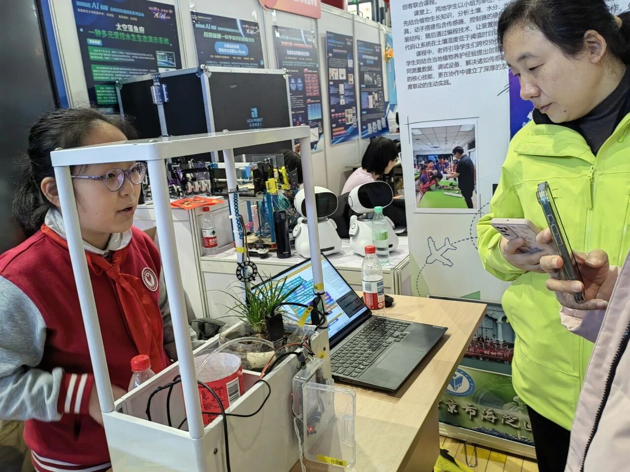 “我们动手搭建了包含传感器、控制器的硬件装置,比如为监测土壤湿度的传感器设计专属安装结构,然后再通过编程技术,让装置能根据实时数据自动调节灌溉、光照等操作,系统会在土壤湿度低于阈值时自动启动浇水程序。”在海淀区实验小学展位前,该校五年级学生李婉欣边操作她参与制作的“智能土培系统”,边向参观人员介绍作品的原理和应用情况。