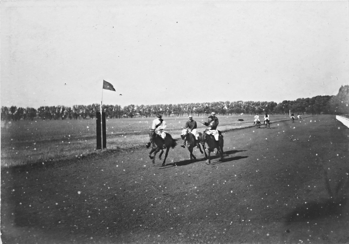 西便门跑马场,骑手们正冲向终点。