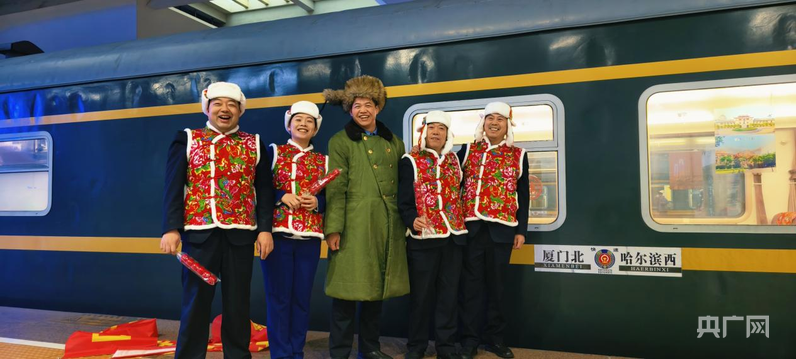 央广网厦门2月2日消息(记者 邬眉 通讯员 张海强)红灯笼在车厢连接处轻轻摇晃,红辣椒串悬在窗边,乘务员一身鲜艳的大花袄、头戴毛茸茸的东北帽,在车门边笑迎旅客……清晨,厦门北站一声带着北方口音的招呼,为2026年春运首日拉开温情的序幕。2月2日,哈尔滨客运段值乘的K974次列车从这里启程,一路向北,驶向3500多公里外的“冰城”哈尔滨。