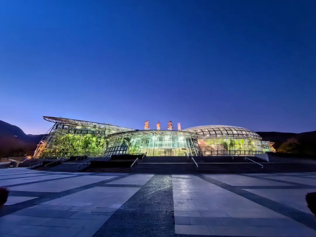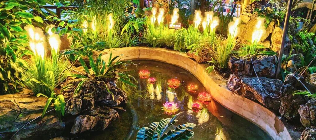 夜晚的展览温室如同一颗璀璨的明珠,绽放出迷人的光彩。室外寒风凛冽,室内温暖如春,各色花卉巧妙搭配,与灯光艺术完美融合,市民游客可以在这里度过花卉光影交织的梦幻之夜,探索植物的奇妙世界。
