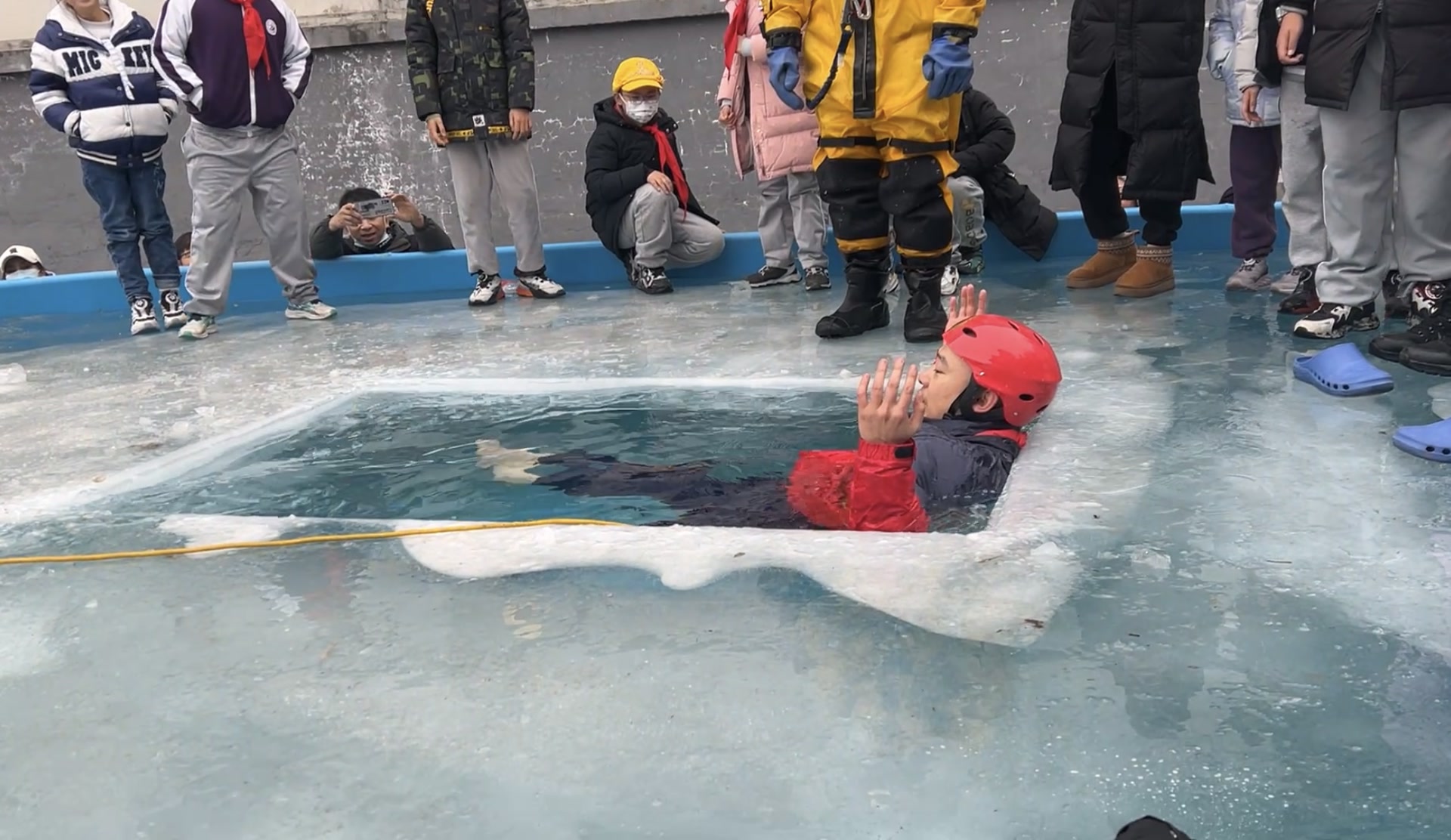 为能够让孩子真实感受到“玩野冰”的危险,消防员们利用基地内简易游泳池模拟制作了“野冰环境”。两名消防员冒着严寒跳入冰水之中,现场演示遇到冰面破裂、掉入冰水、营救同伴等情况的科学自救和施救方法。