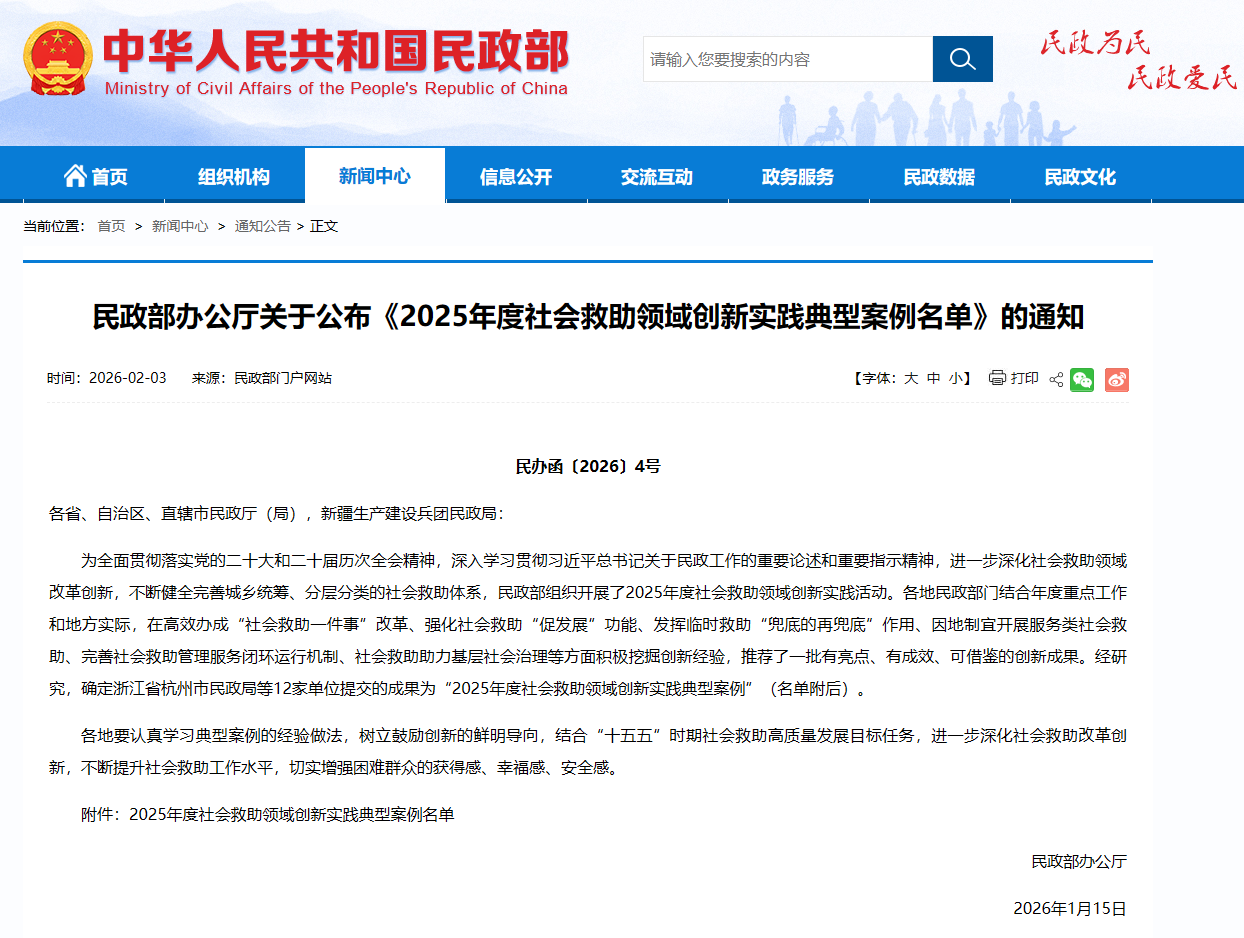 民政部办公厅关于公布《2025年度社会救助领域创新实践典型案例名单》的通知