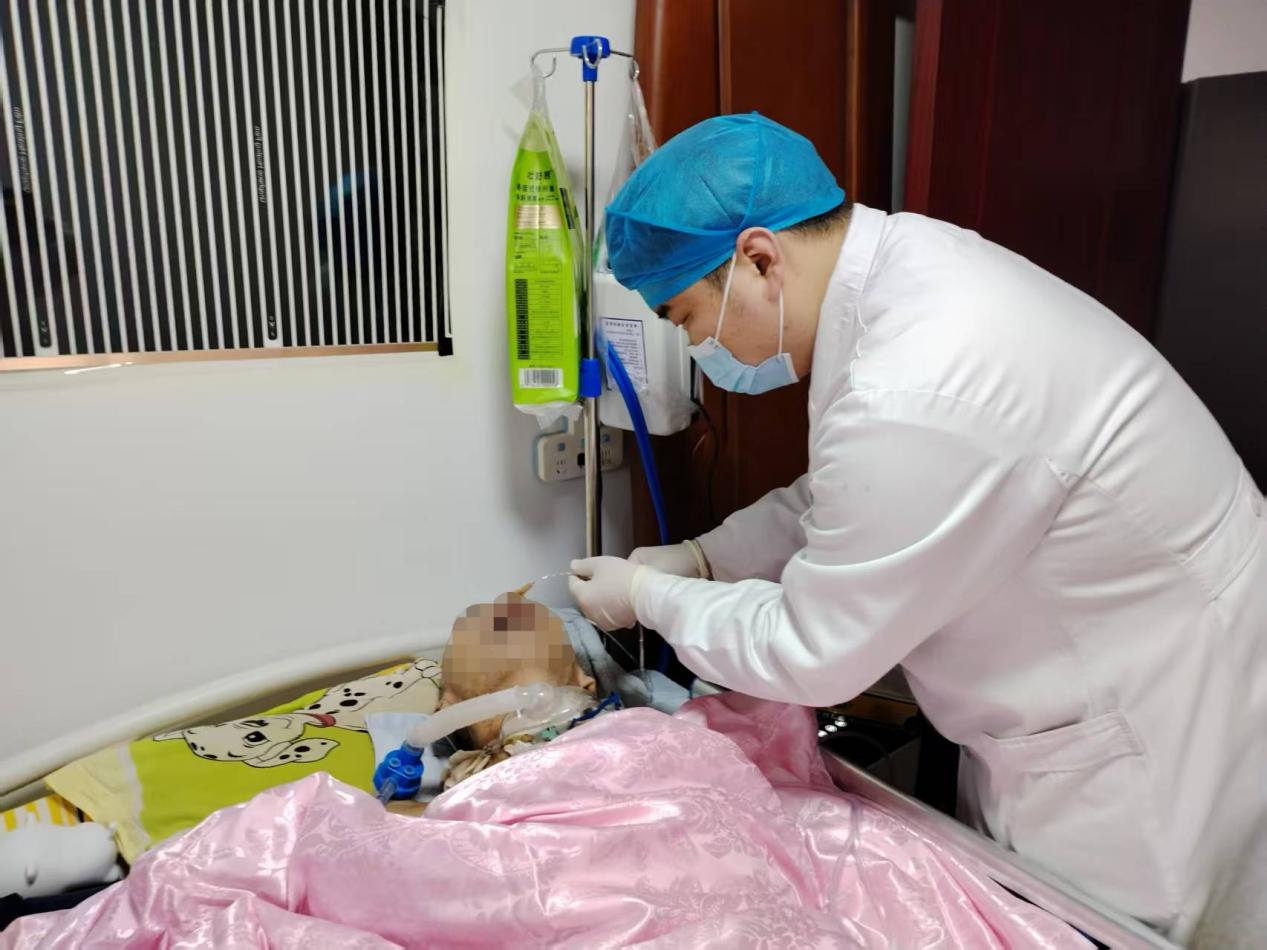 王建华医生先为患者测量血压、听诊心肺,完成初步评估。随后,护士小陈严格遵循无菌操作流程,动作轻柔娴熟地为患者更换了胃管和尿管。操作完毕,医护人员又针对这位卧床失能老人的特殊情况,进行了细致的护理指导:“冬季管道易变硬,要注意保护,避免打折受压。每天需用温水清洁鼻腔和尿道口两次,保持干燥。翻身时要小心,用手托住管道接口,防止牵拉脱落……”鉴于患者的身体状况,他们特别叮嘱:“饮食应以温热的流食为主,通过胃管注水也要少量多次,保证充足饮水,避免脱水。”