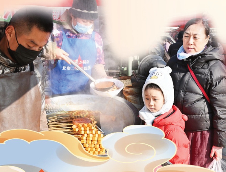 集市里,老北京的地道小吃更是少不了。金黄炸糕在油锅里滋滋作响,刚出锅时香气四溢。摊主手工包入红豆沙馅,炸至外皮酥脆、内里软糯,清甜不腻。“趁热吃暖到心底,带回家加热照样香酥!”摊主笑着递出一块。另一边,老北京“十三绝”之一的切糕,软糯绵密、豆香浓郁,制作全程可见。买上几块带回家,便是扎实又地道的年味记忆。边逛边吃,各种京味小吃应有尽有,每一口都是熟悉的老味道。