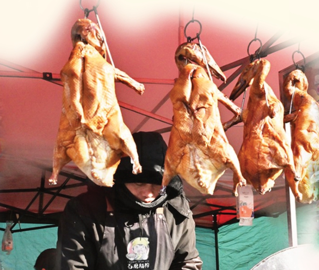 大集俨然成了地方小吃的“博览会”。卤煮火烧支起大锅,浓汤飘香;东北杀猪菜散发着豪迈的酸香;河南师傅用擀面杖将面饼擀开,挑破,灌入蛋液,在铁板上烙得两面焦黄;安徽牛肉板面的招牌红艳,辣椒与牛肉的香气极具侵略性;山东大煎饼的鏊子,更是亮得反光。