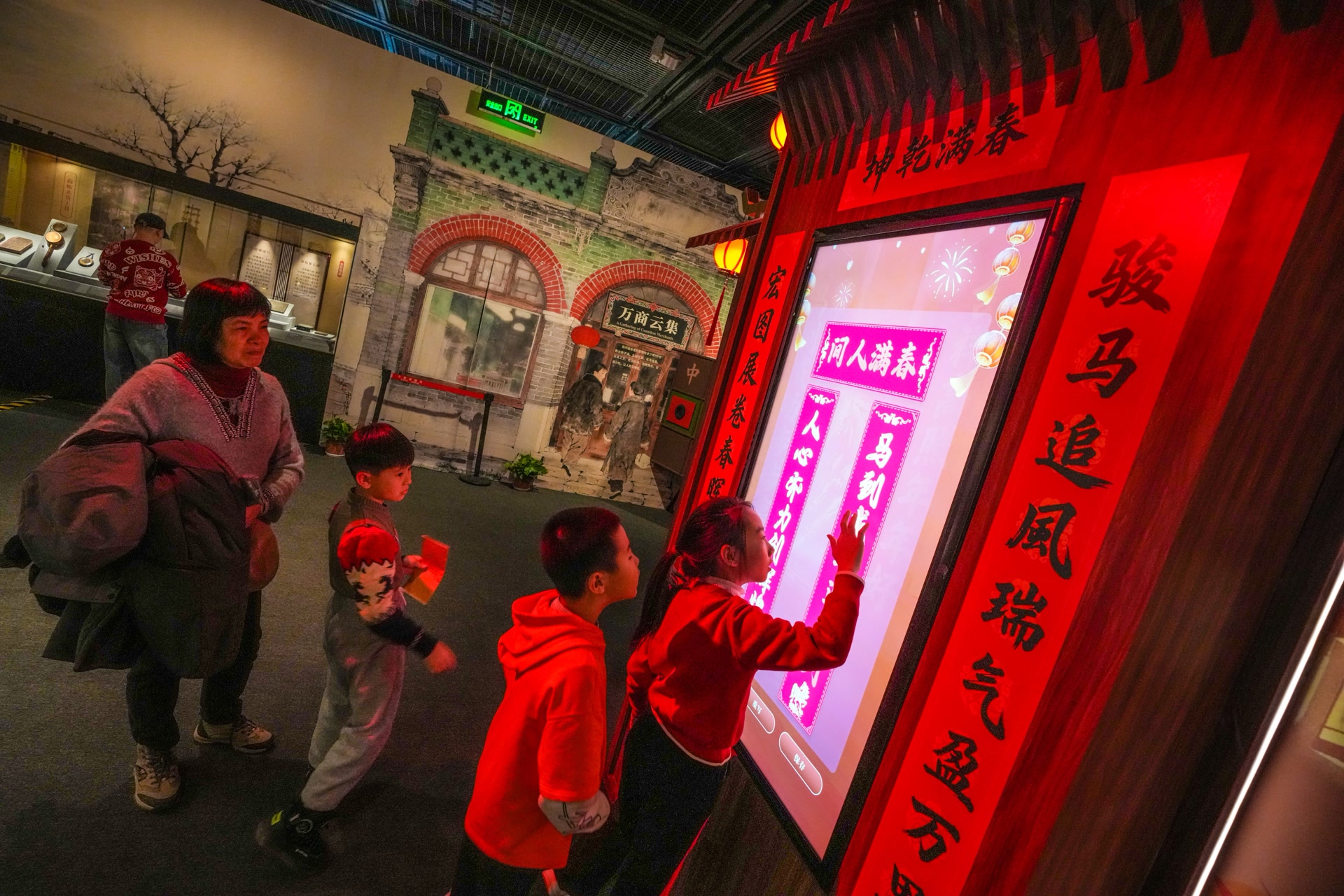 一进展厅,年味儿扑面——红色唱主调,展厅里处处张灯结彩。一面巨鼓上,投影着不停变化的马形象,互动屏里呈现出热闹的舞狮动画,让观众仿佛走进了热闹的庙会现场。