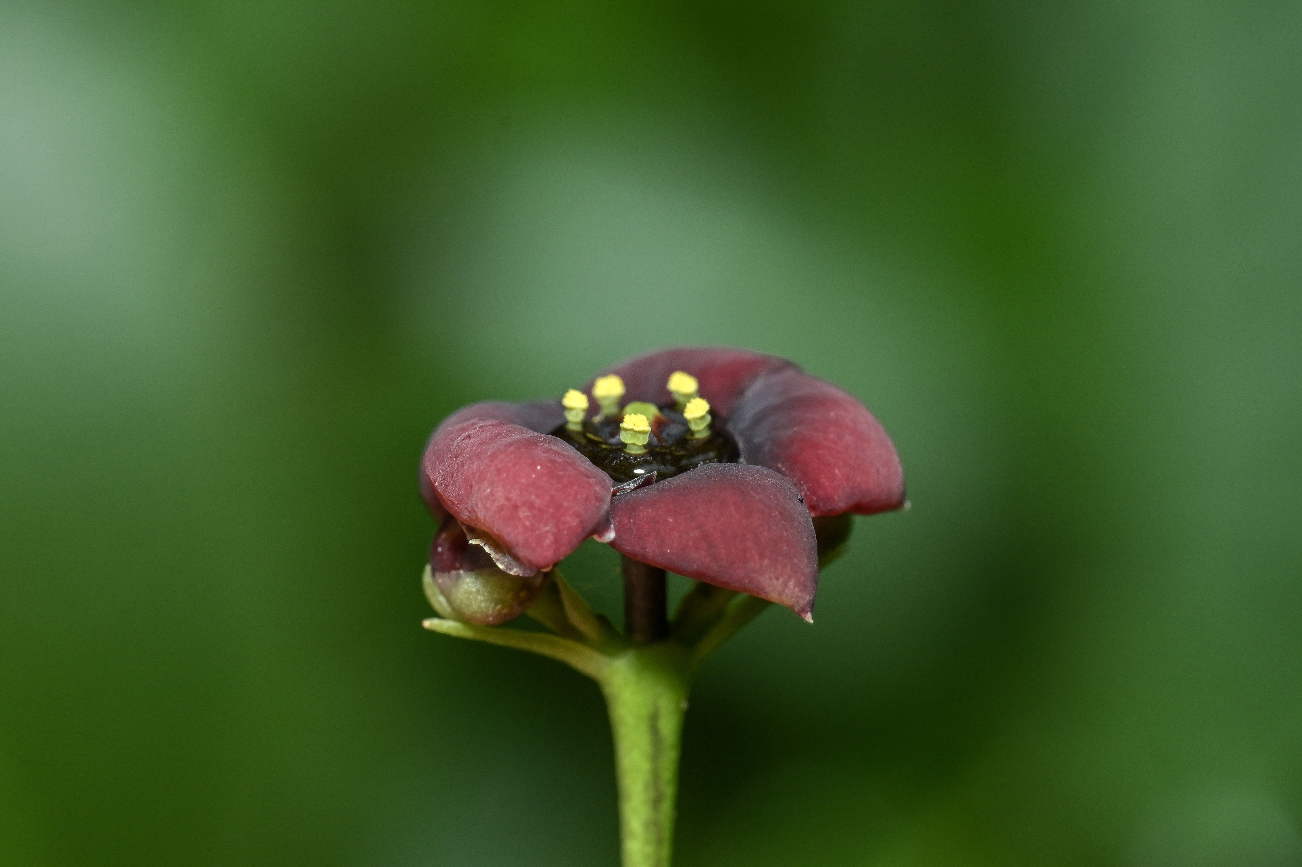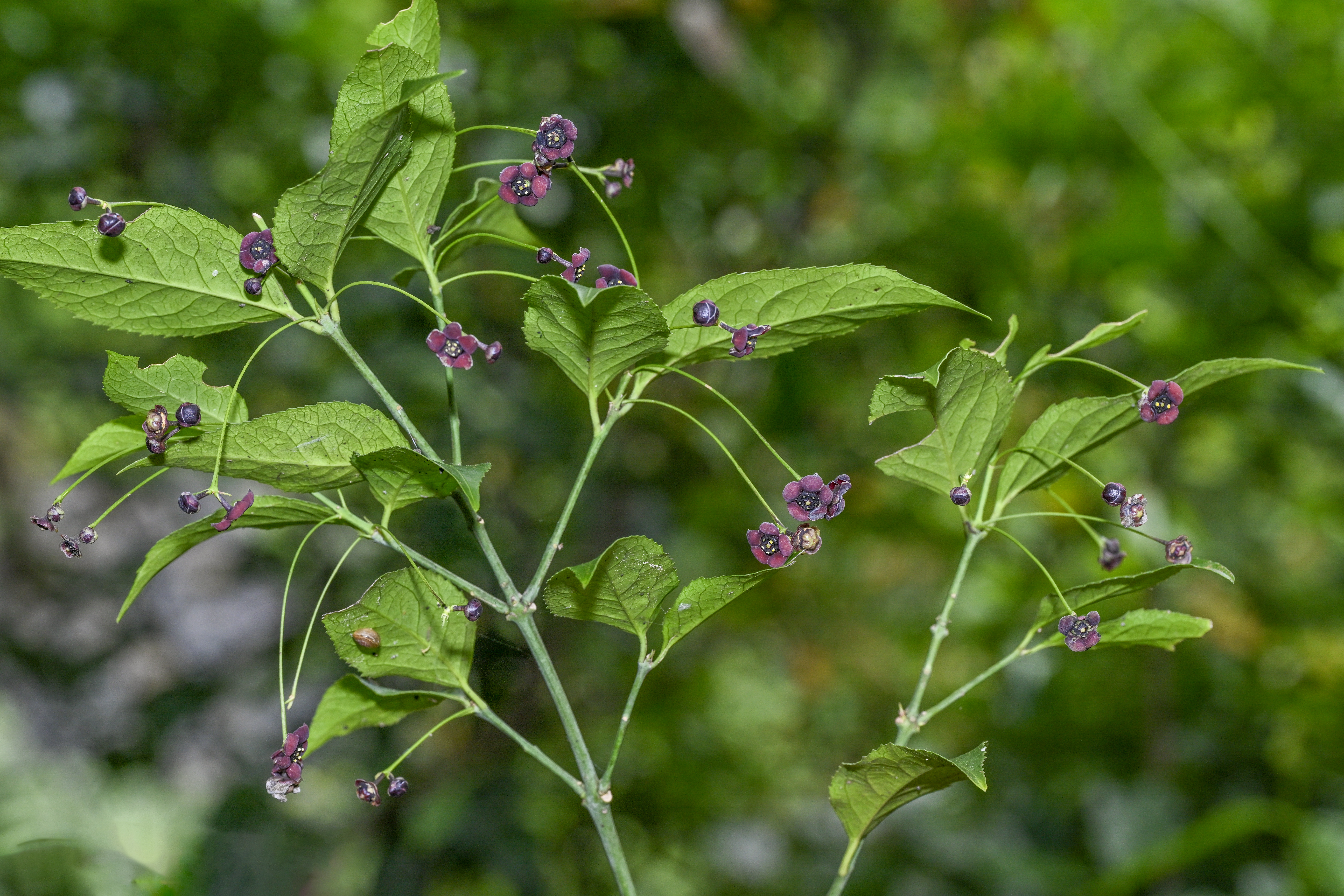 “茅台卫矛”是一种常绿灌木,其主要特征为:叶对生,宽披针形;花序梗极长;花紫色,有4至5瓣,蒴果球形,从形态上明显区别于卫矛属其他物种。经过多次系统性考察,发现“茅台卫矛”约有200株,其果实结实率低,自我更新能力较弱。