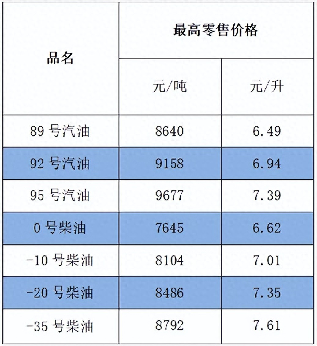 92号汽油由每升6.77元调整为6.94元,提高0.17元;
