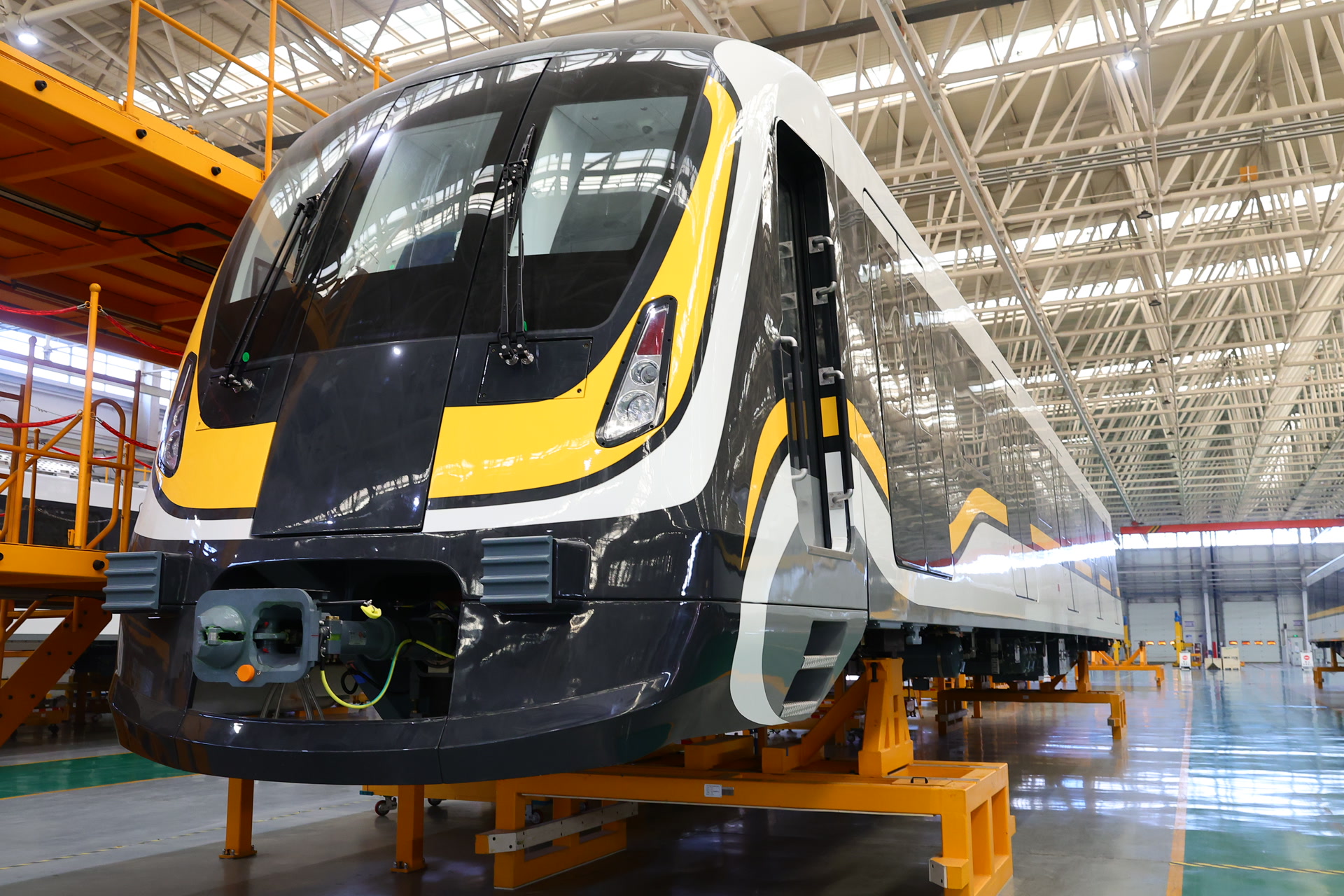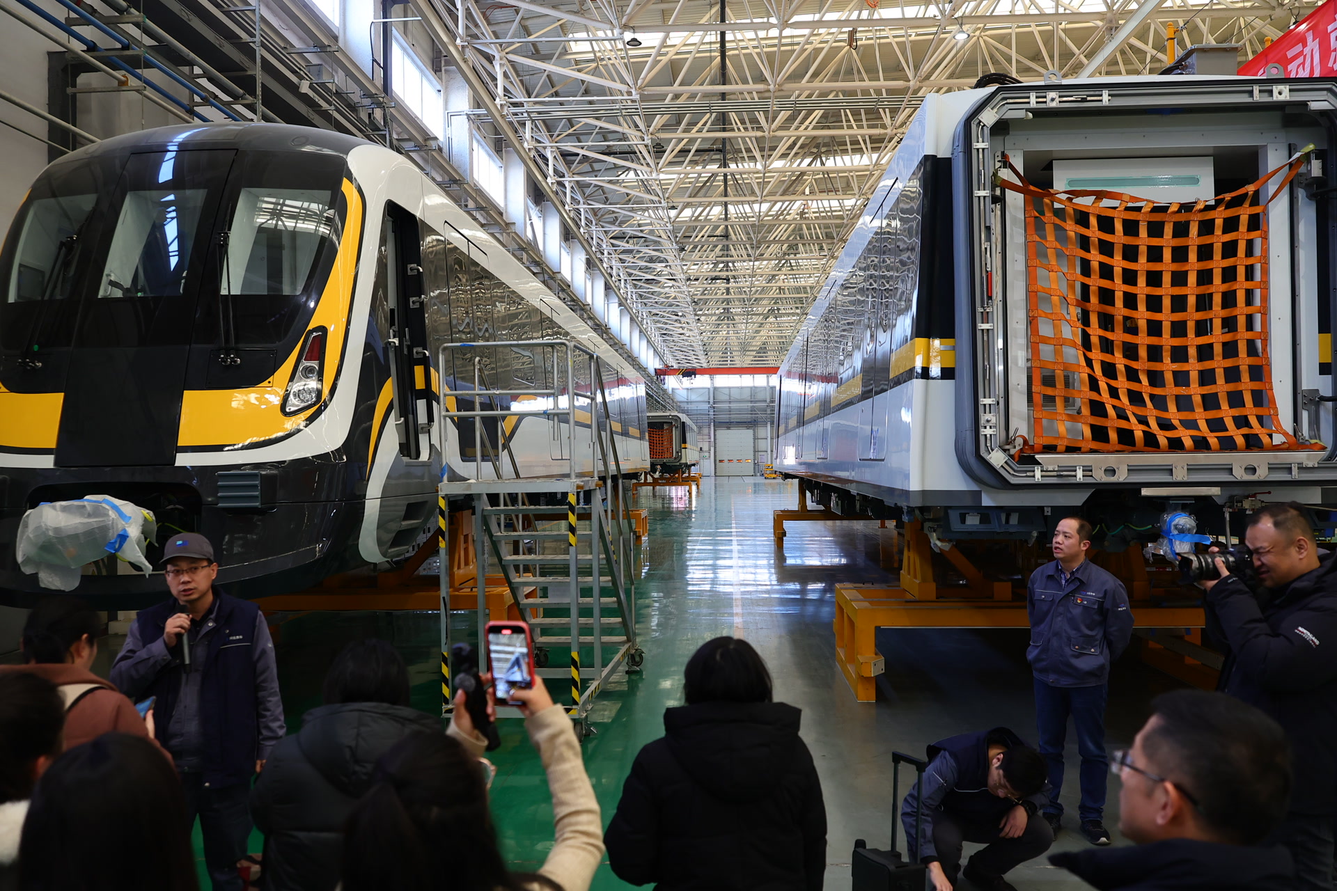2月3日,采访团来到了河北京车智能制造基地。在总组装部车间,一排地铁列车车厢正在进行组装准备,工人在车厢内外忙活。