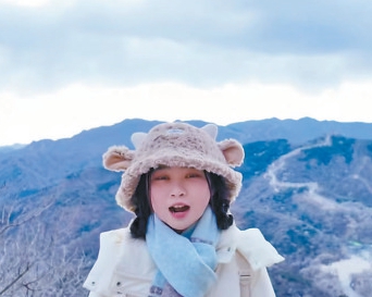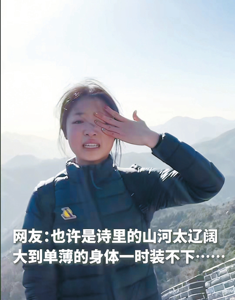 在这些视频中,有一位台湾女生戴着毛茸茸的针织帽,裹着厚羽绒服,在群山环抱中用清亮的普通话念出:“天高云淡,望断南飞雁……不到长城非好汉,屈指行程二万。”