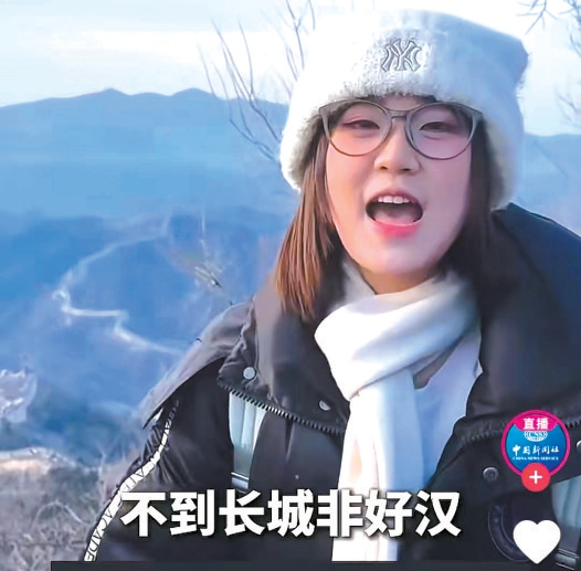 女大学生小时和同行的两位伙伴,在看到了“羊驼同学”的视频后,也想在长城上录一段诗朗诵的视频。小时说:“最近刷到很多在长城上朗诵毛主席诗词的视频,特别火,我们也想打卡,记录这次难忘的旅行。当我真正站在这里,看到长城内外壮丽辽阔的景色,心里真的特别激动澎湃,就想通过朗诵来抒发这种心情。”