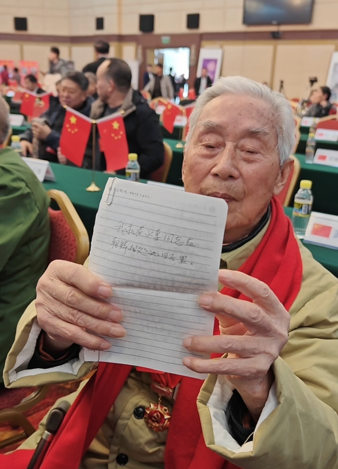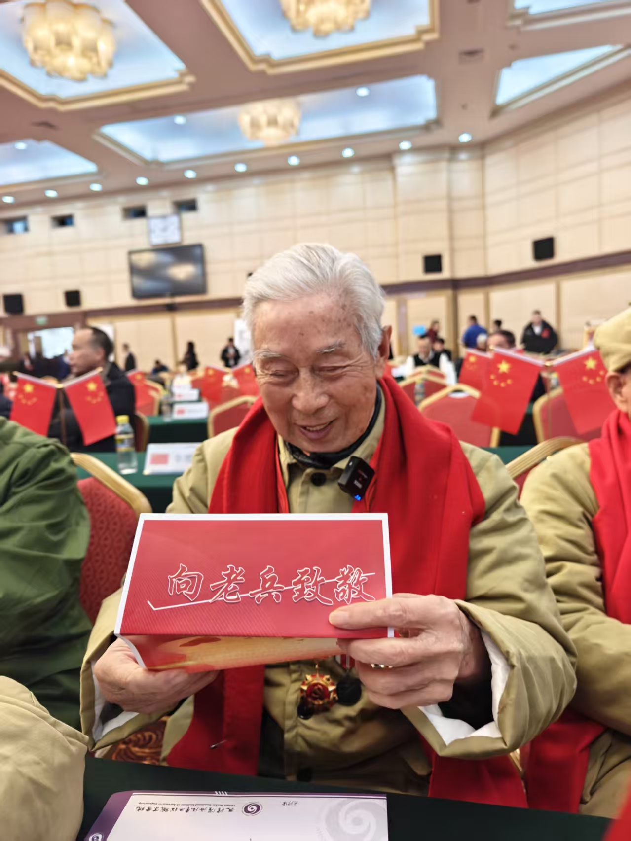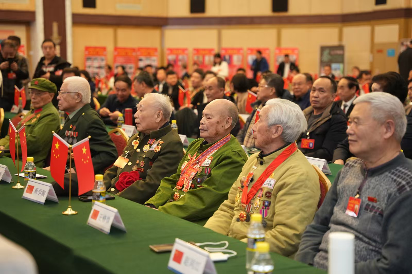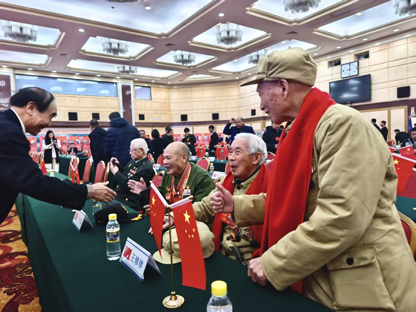 会场内暖意融融,周学陶、王修律、赵同江、河露基、曹家麟、王光明、郑立冰……久别重逢的志愿军老兵团聚在一起。尽管都是90多岁高龄,但老兵们精神矍铄,身体硬朗。“从那边数,他93、他92、我91,我们按这个顺序排的,1、2、3!”老兵们围坐在一起,像孩童般笑着盘点彼此的年龄,言语间满是历经岁月沉淀的默契。