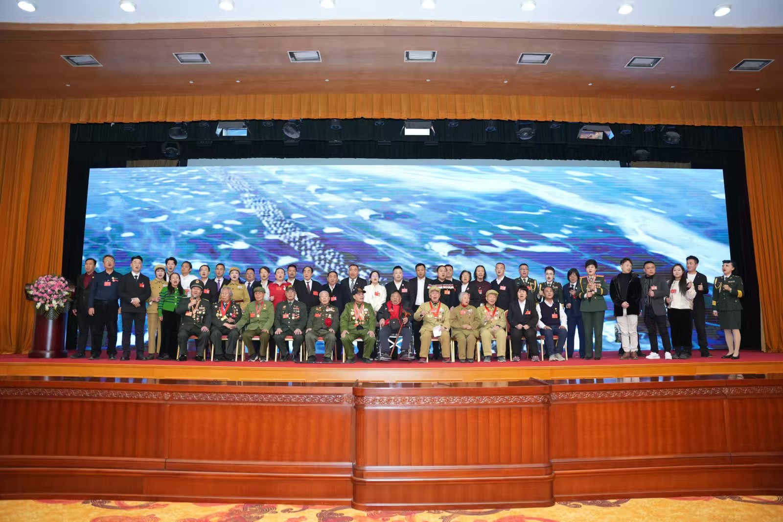 文艺表演环节,一曲曲红色旋律点燃全场热情。最动人的莫过于全体合唱《中国人民志愿军战歌》,老兵们身姿挺拔如当年出征之时。