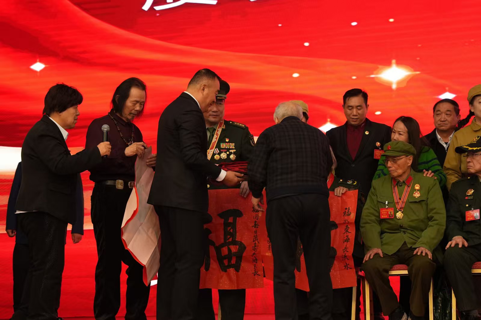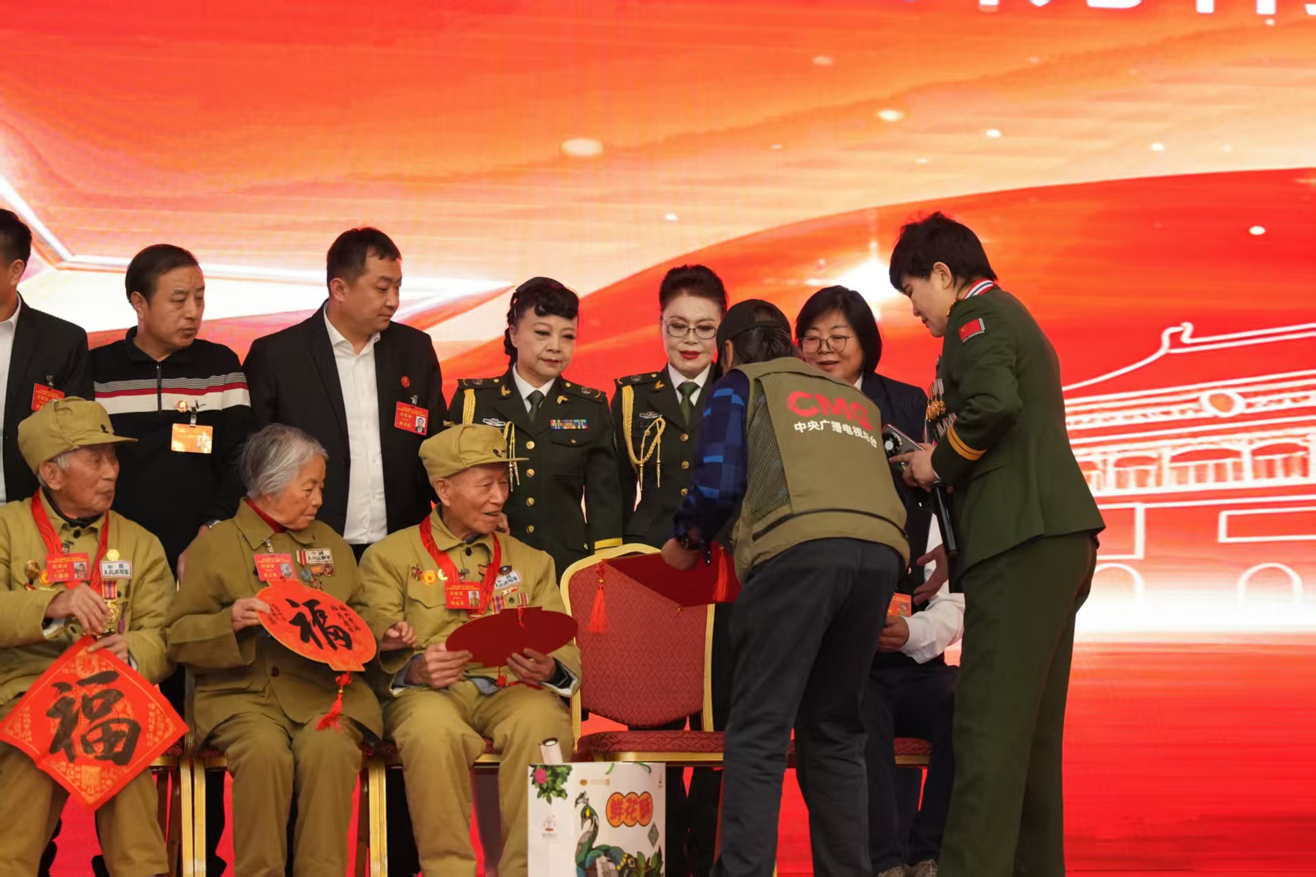 爱心馈赠环节同样温情满满。红包、书画、剪纸、营养品……各方捐赠的慰问品让老兵们倍感温暖,连连道谢。