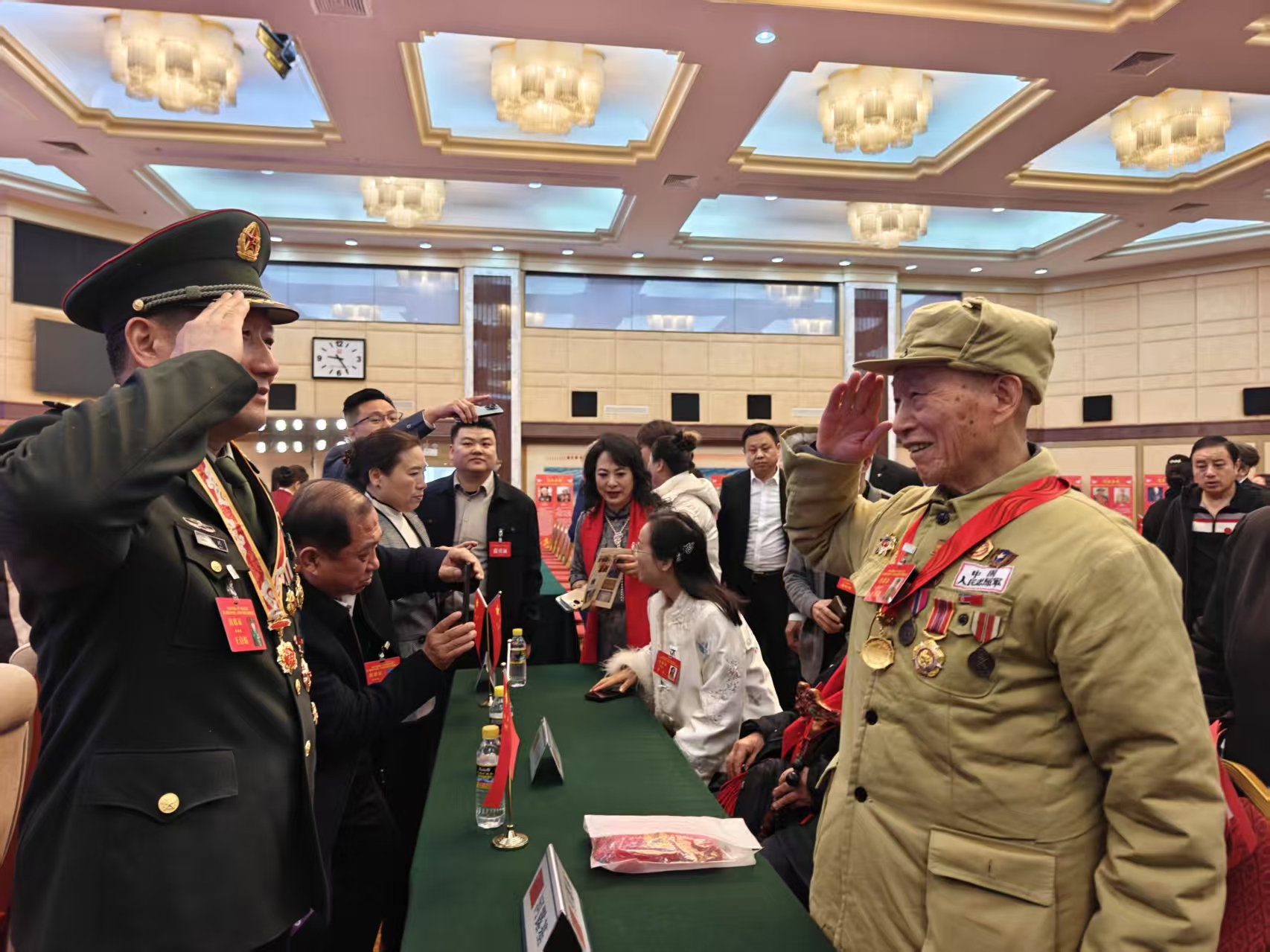 65岁的一等功臣王自焰特意到场为老兵们送祝福,志愿军老兵也向他敬上军礼:“你也是英雄!”王自焰对着手机的照片告诉老兵:“我父亲也是志愿军老兵,今年93岁,他也很想念这些老战友呢。”