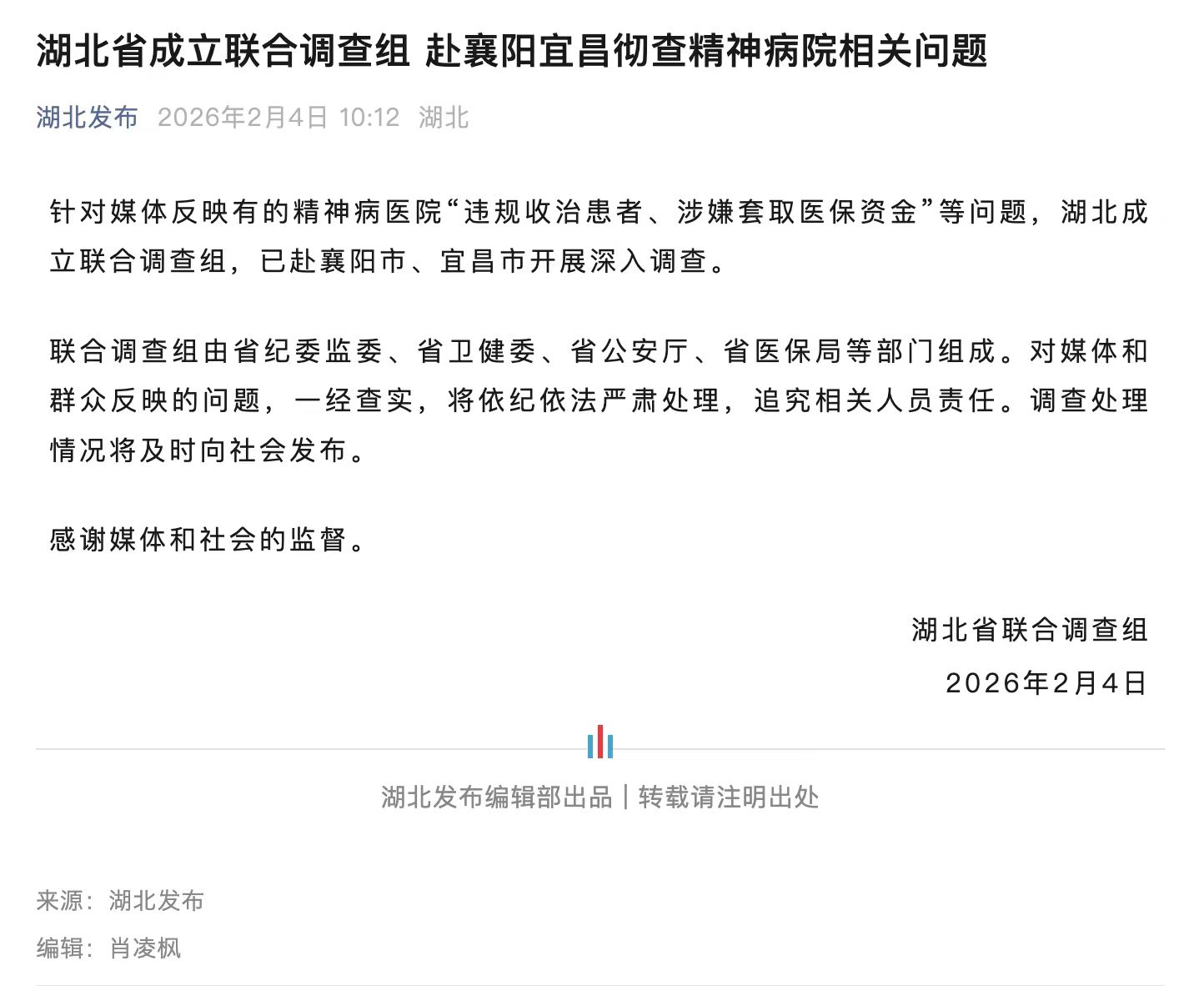 湖北省成立联合调查组,赴襄阳宜昌彻查精神病院相关问题