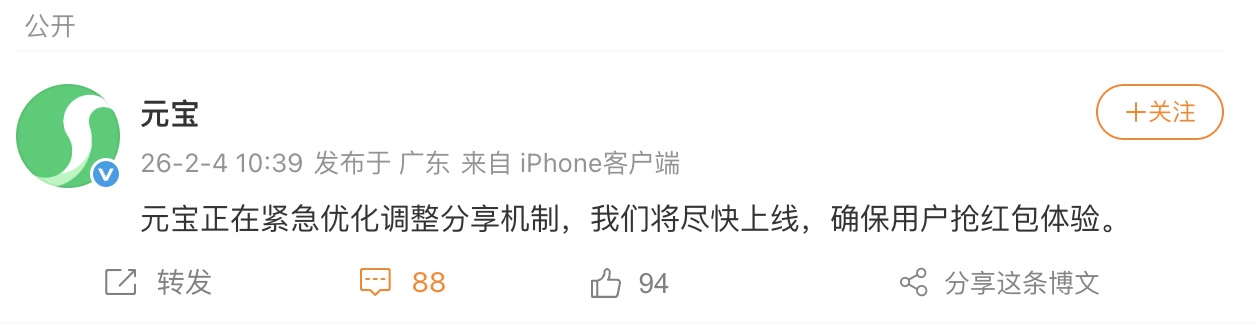 对于微信方面的处置,元宝随即回应称:“正在紧急优化调整分享机制,我们将尽快上线,确保用户抢红包体验。”
