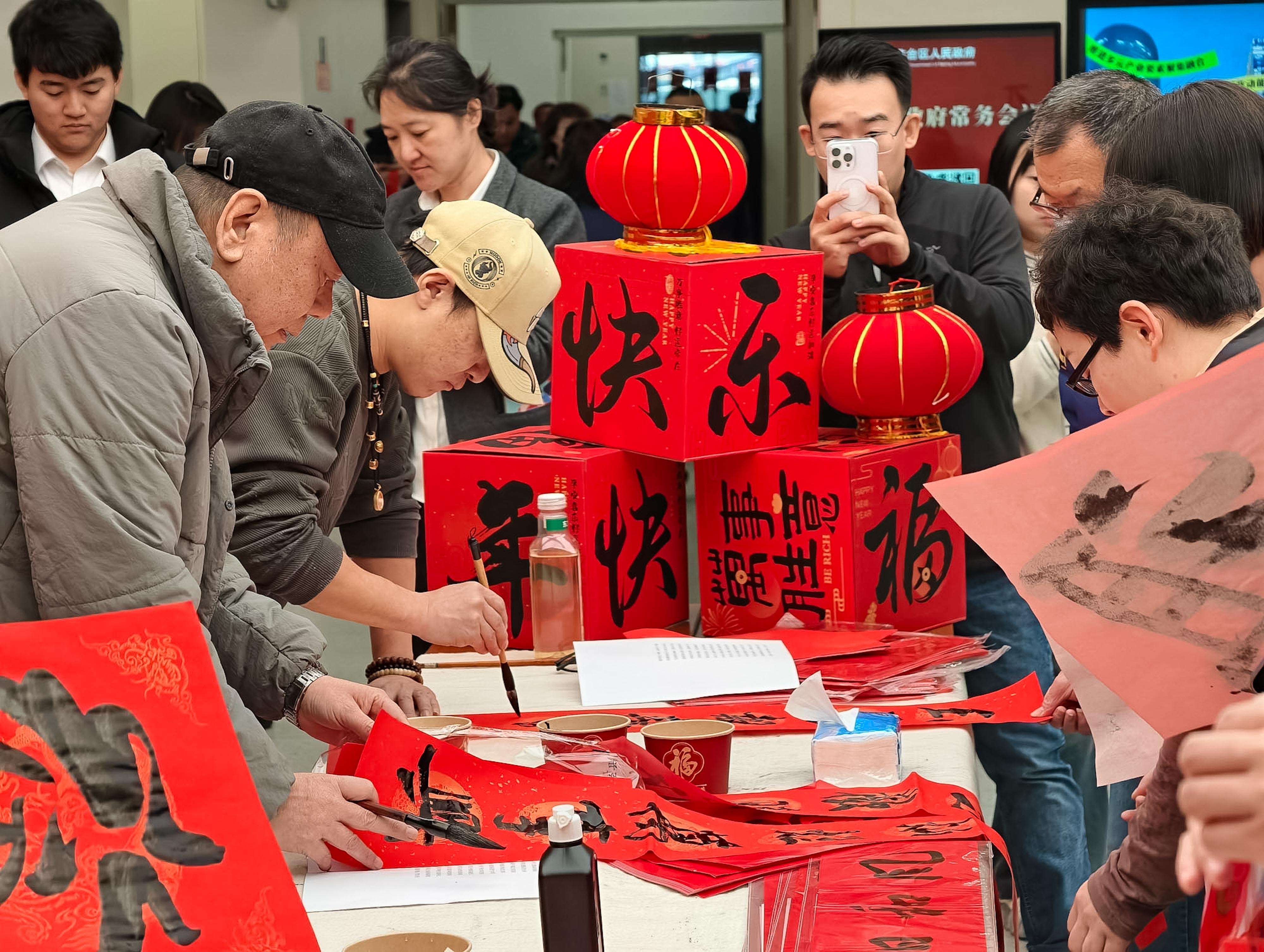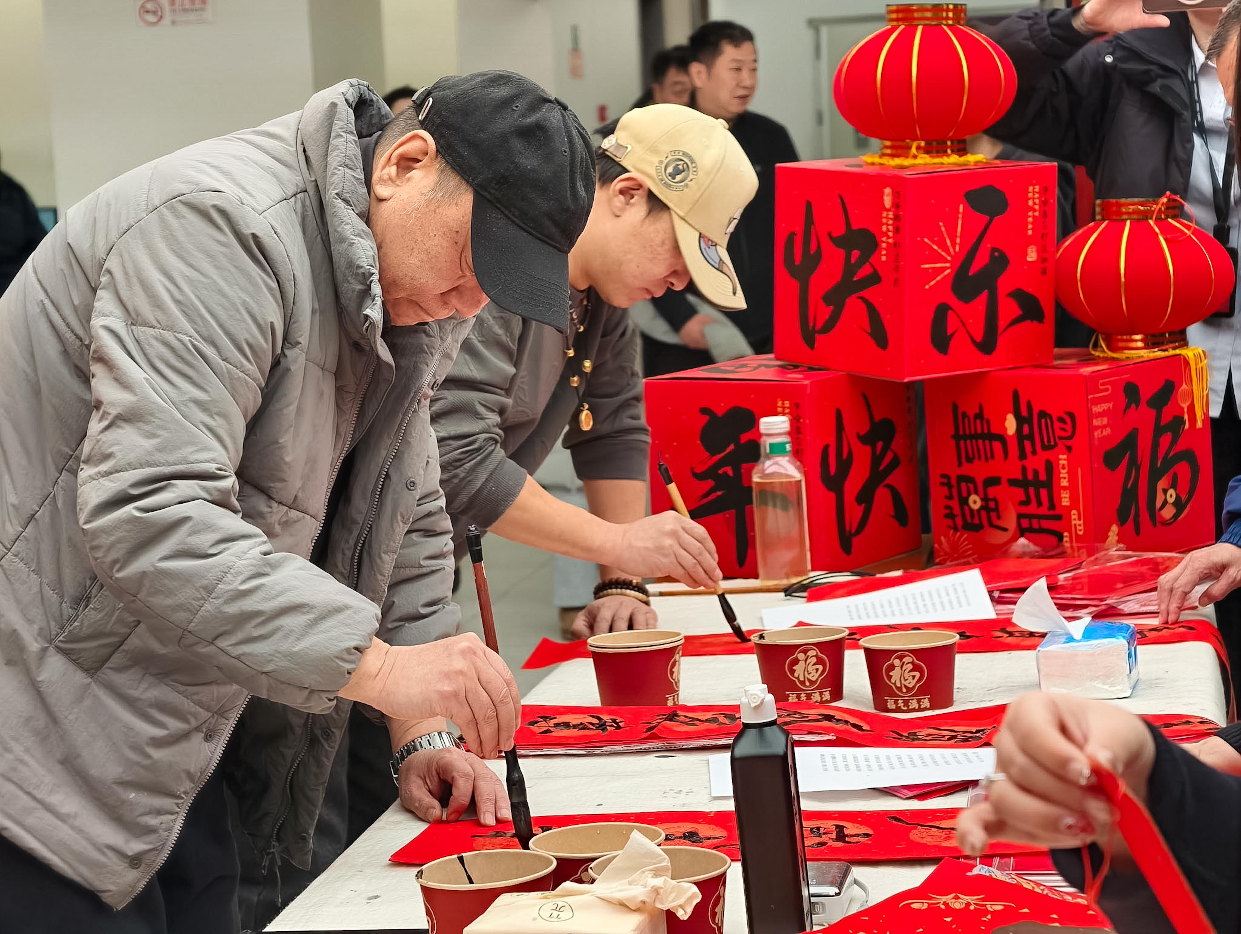 东门“福气打卡地”内,专业书法老师与爱好者现场挥毫,定制“福”字逐一分送办事群众,笔墨间传递马年期许。