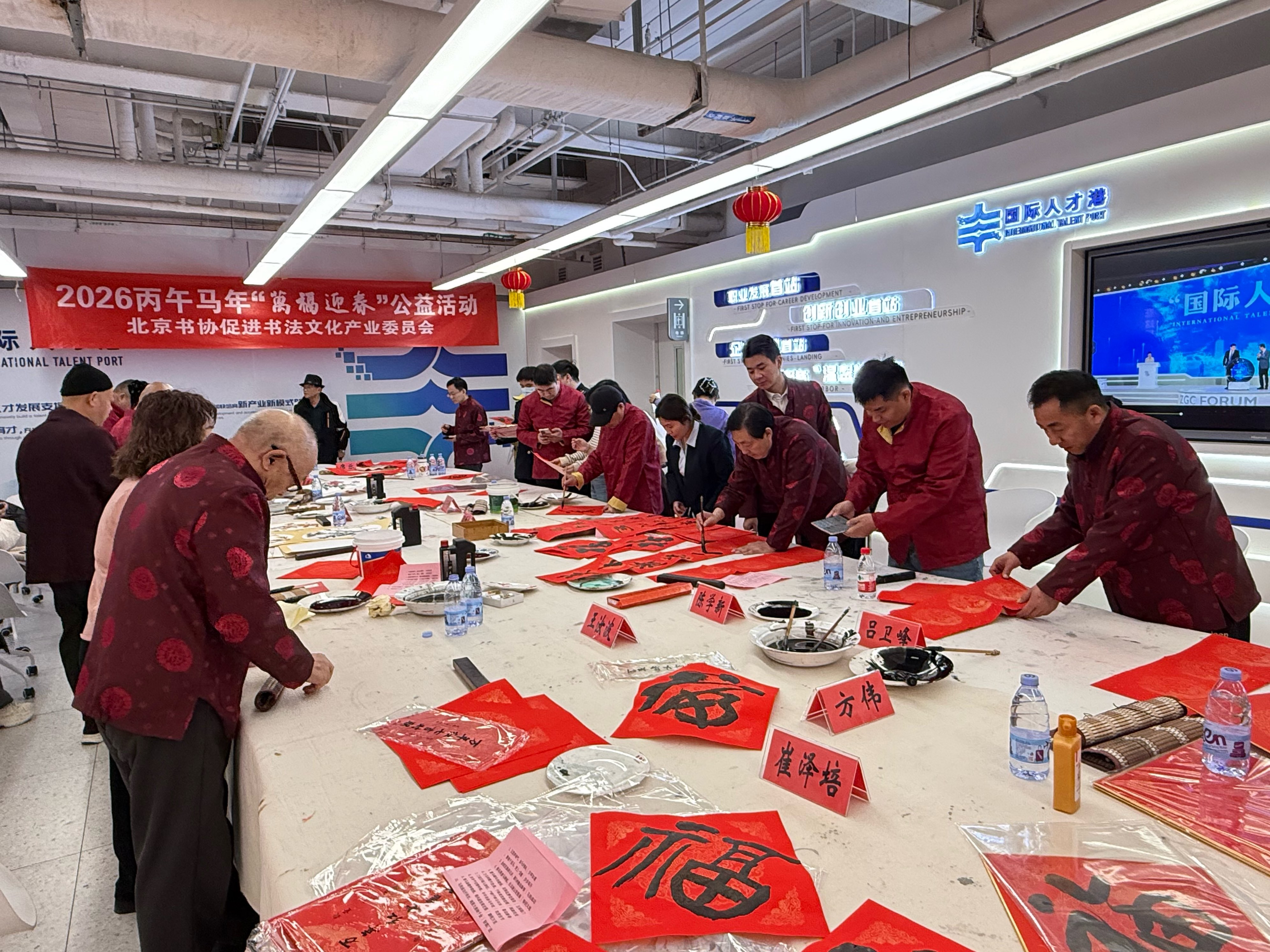 三层国际人才港举办高规格书画笔会,中国书协、美协名家以“岁寒三友”结合马年元素创作,免费赠送春联福字,尽显雅韵。