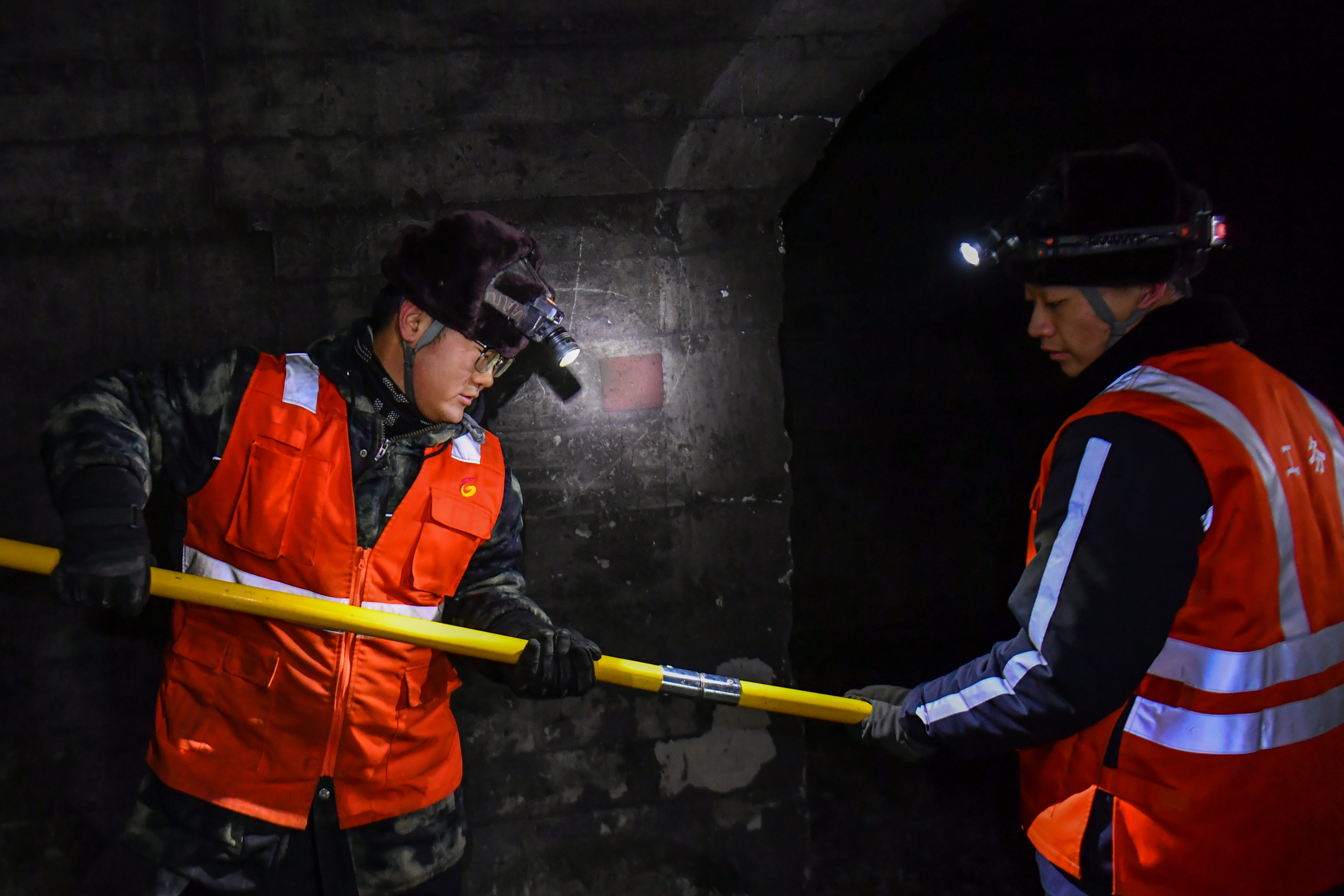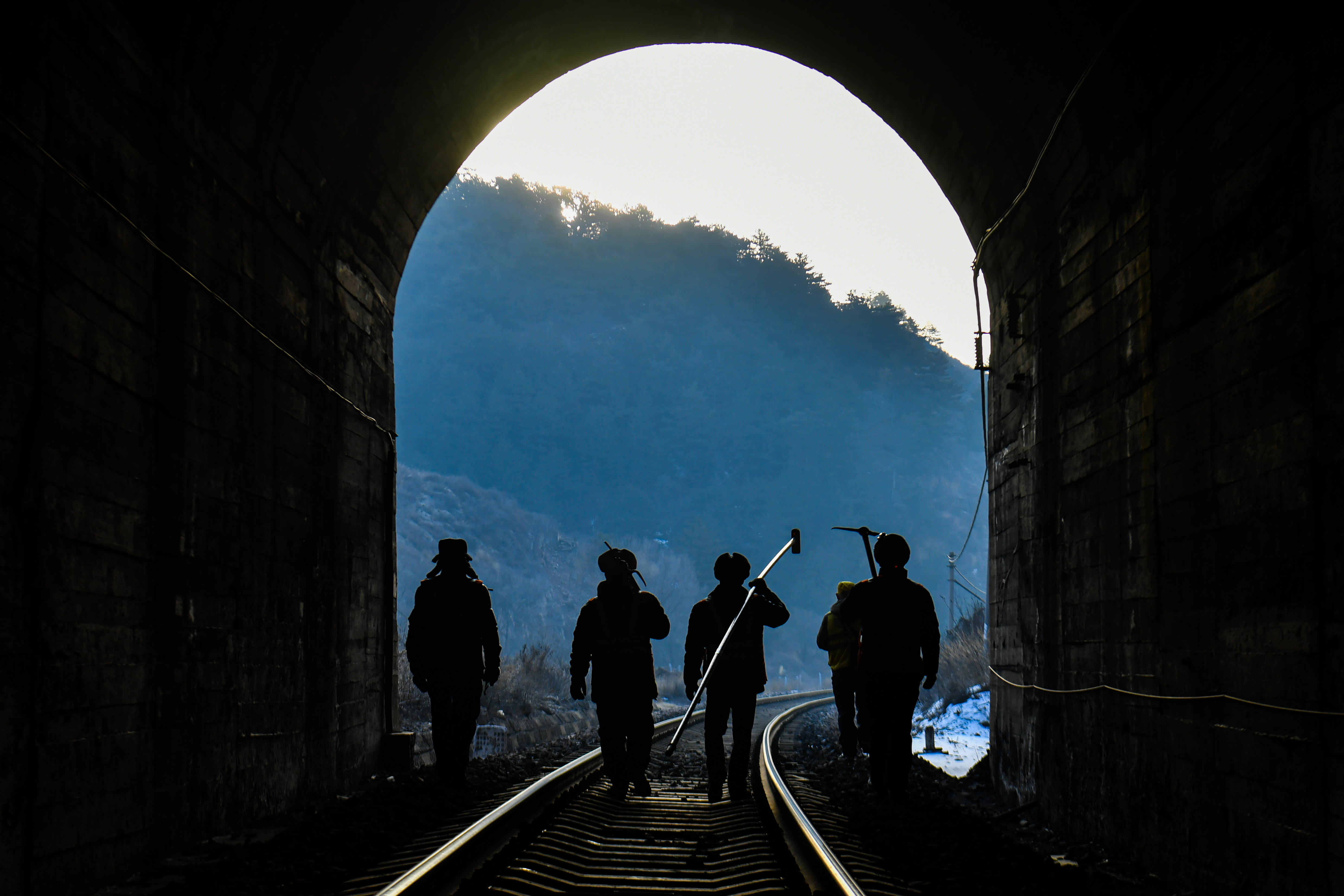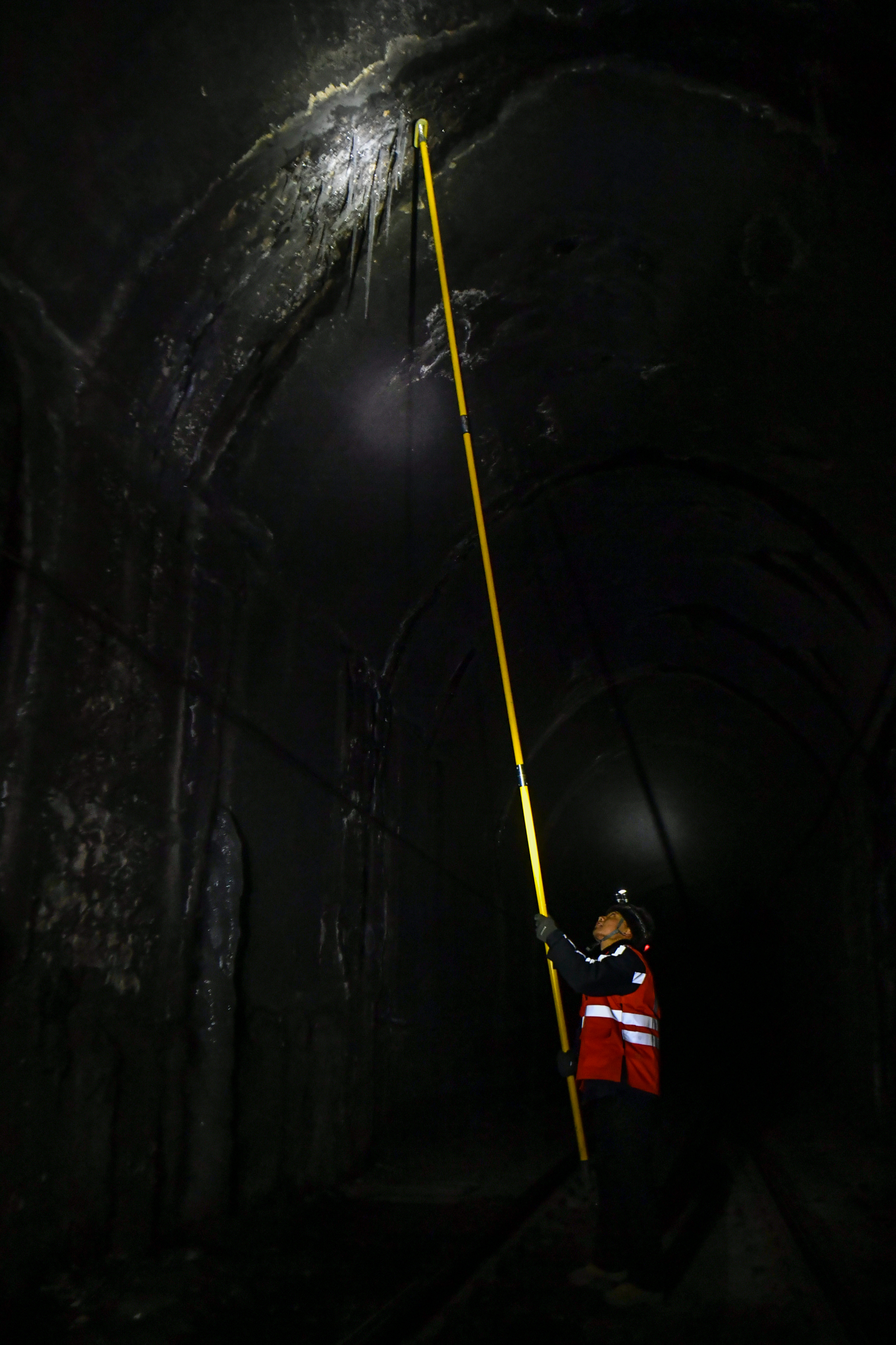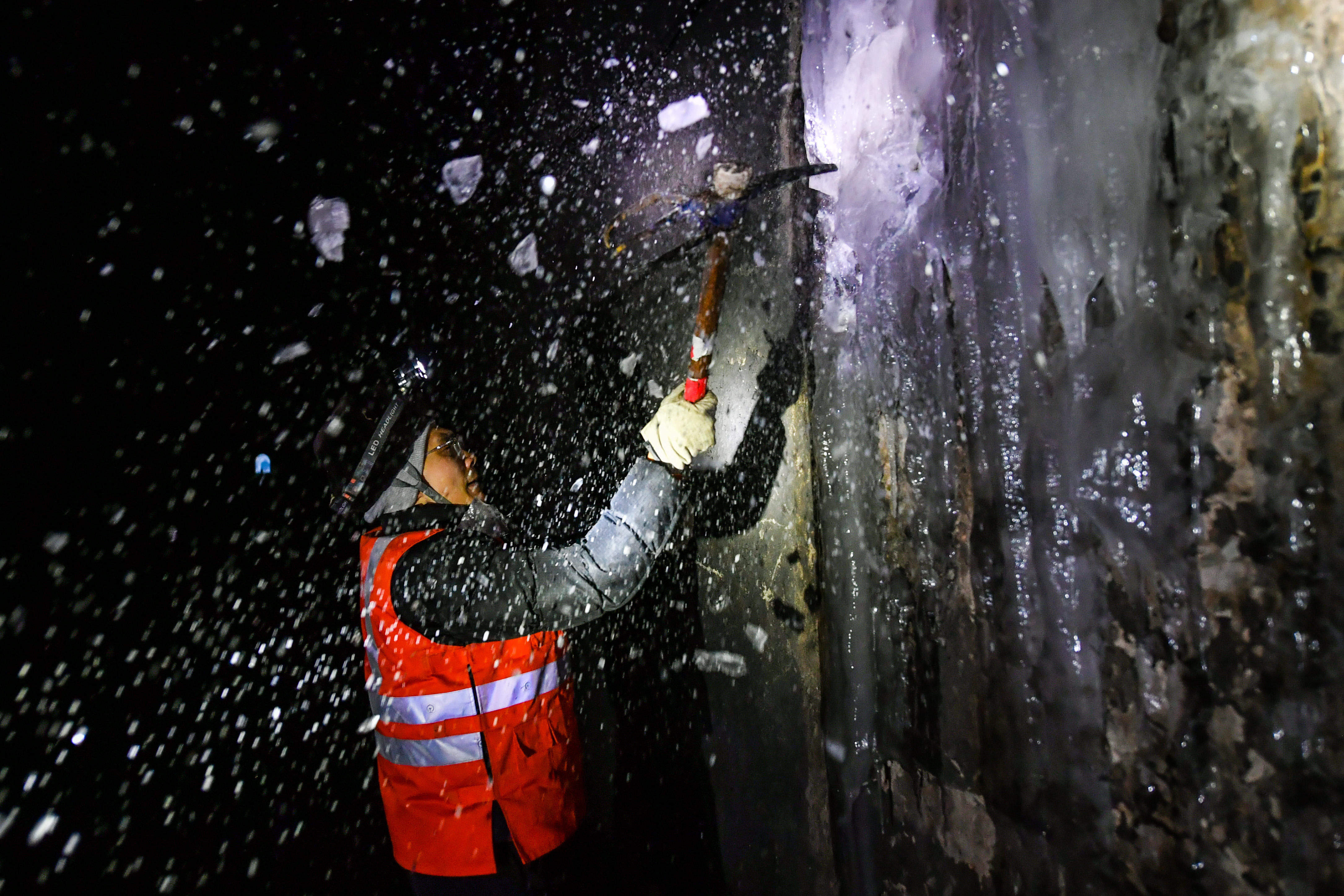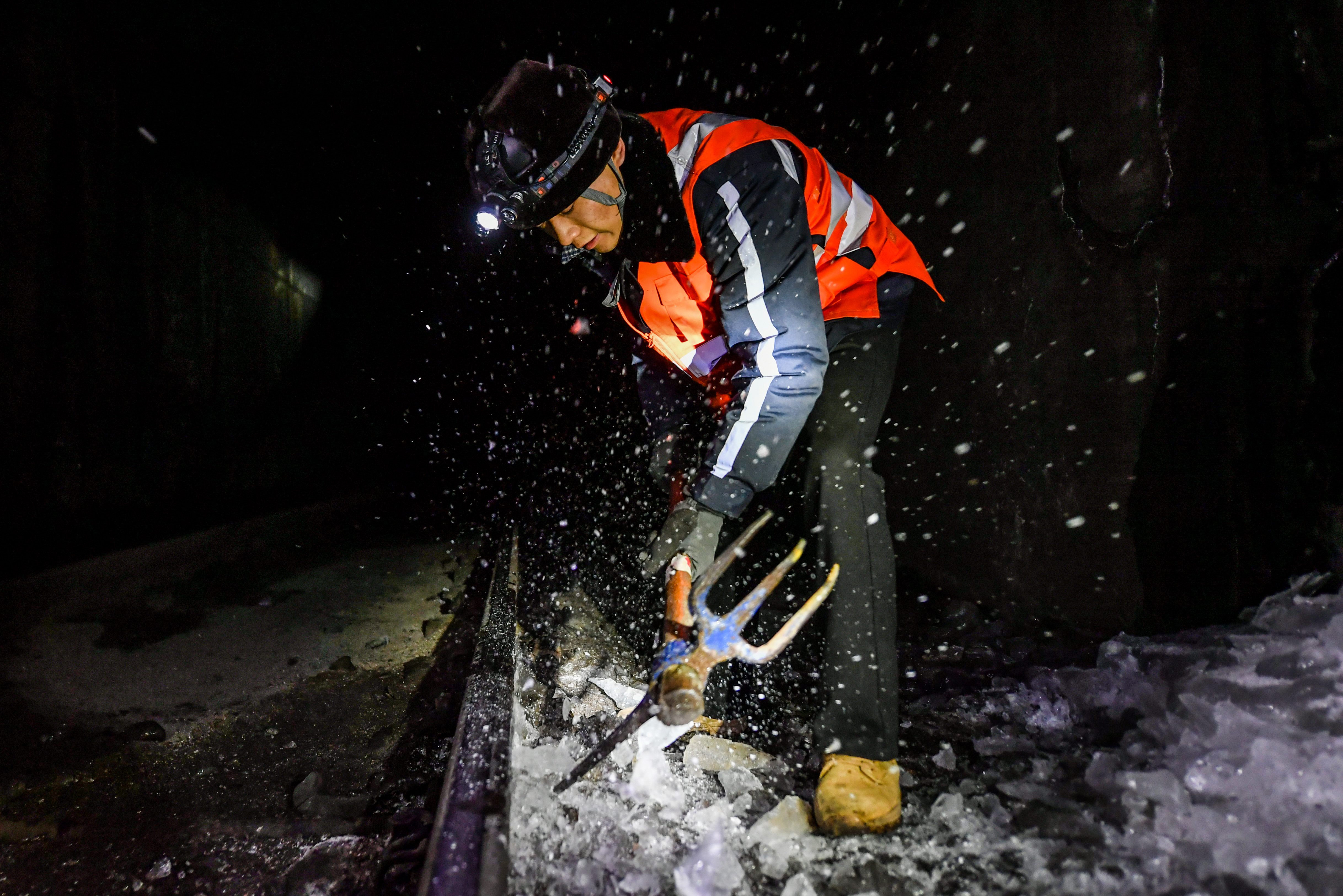 冬日,太行山深处昼夜温差显著,铁路隧道容易出现渗水结冰现象,威胁运输安全,“打冰人”成为列车和乘客安全的守护者。