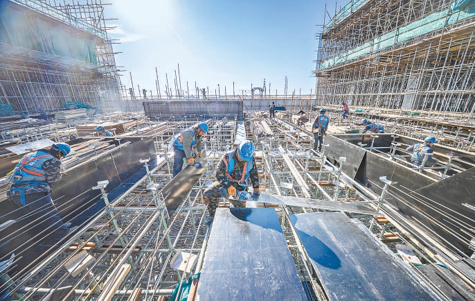 跟着洪锋,记者来到二层施工平台,只见工人们有的俯身绑扎钢筋,有的仰头拼装模板。向东望去,脚手架围合出的空间已初具轮廓。“那是未来商场的东侧中庭,”洪锋指着前方说道,“刚露出两层挑空的模样。”