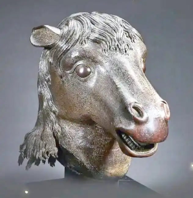 在十二时辰之中,马所对应的时辰为午时,所以马首铜像位于喷泉左方,排列第三。以分铸法、失蜡法和铆接工艺等多种技法制作而成,神态栩栩如生,无论眼神、张口还是微伏耳形等姿态,均自然逼真。而鬃毛的自然铺叠和流利的条理更是一绝,这在其他兽首上是很难见到的。