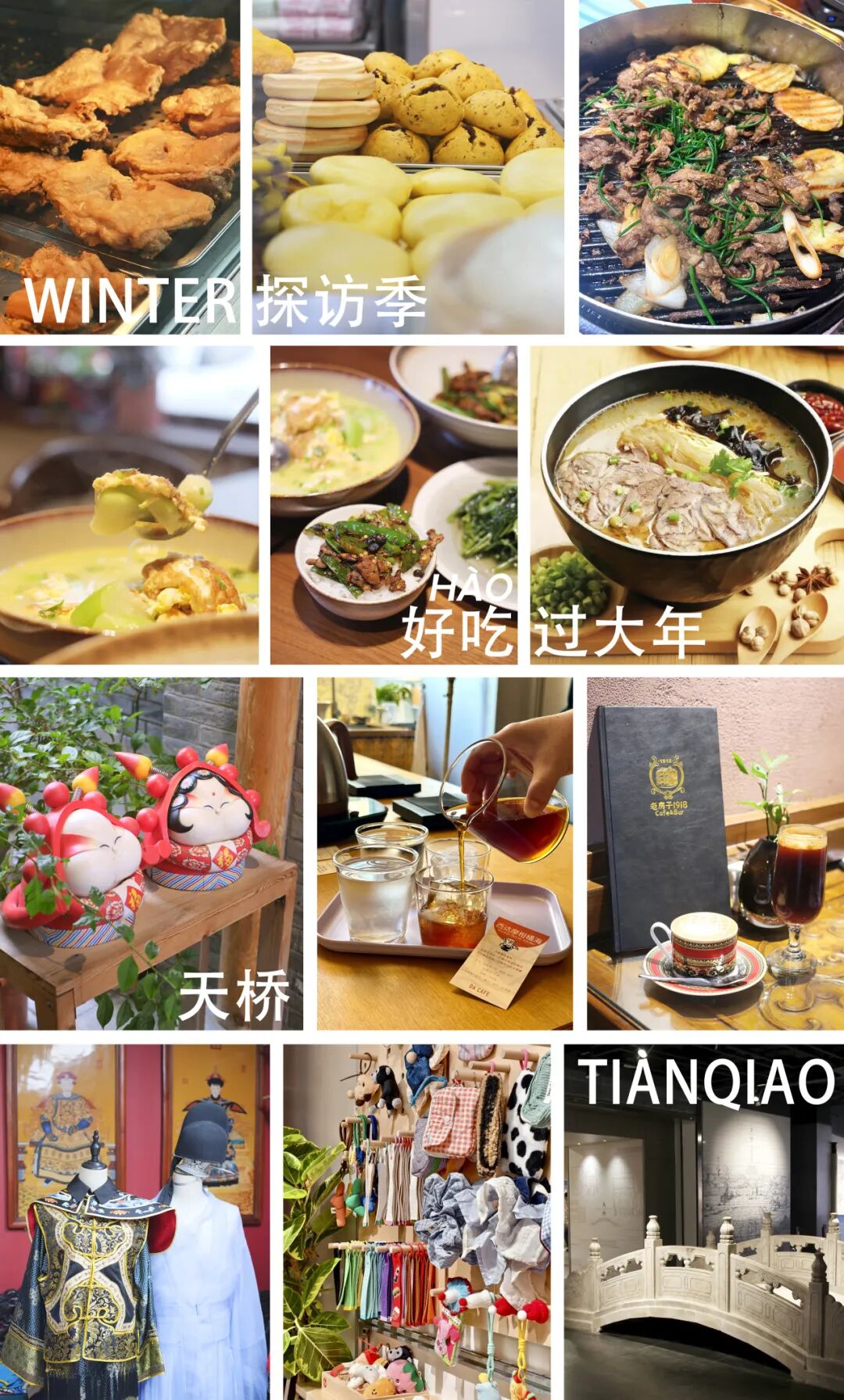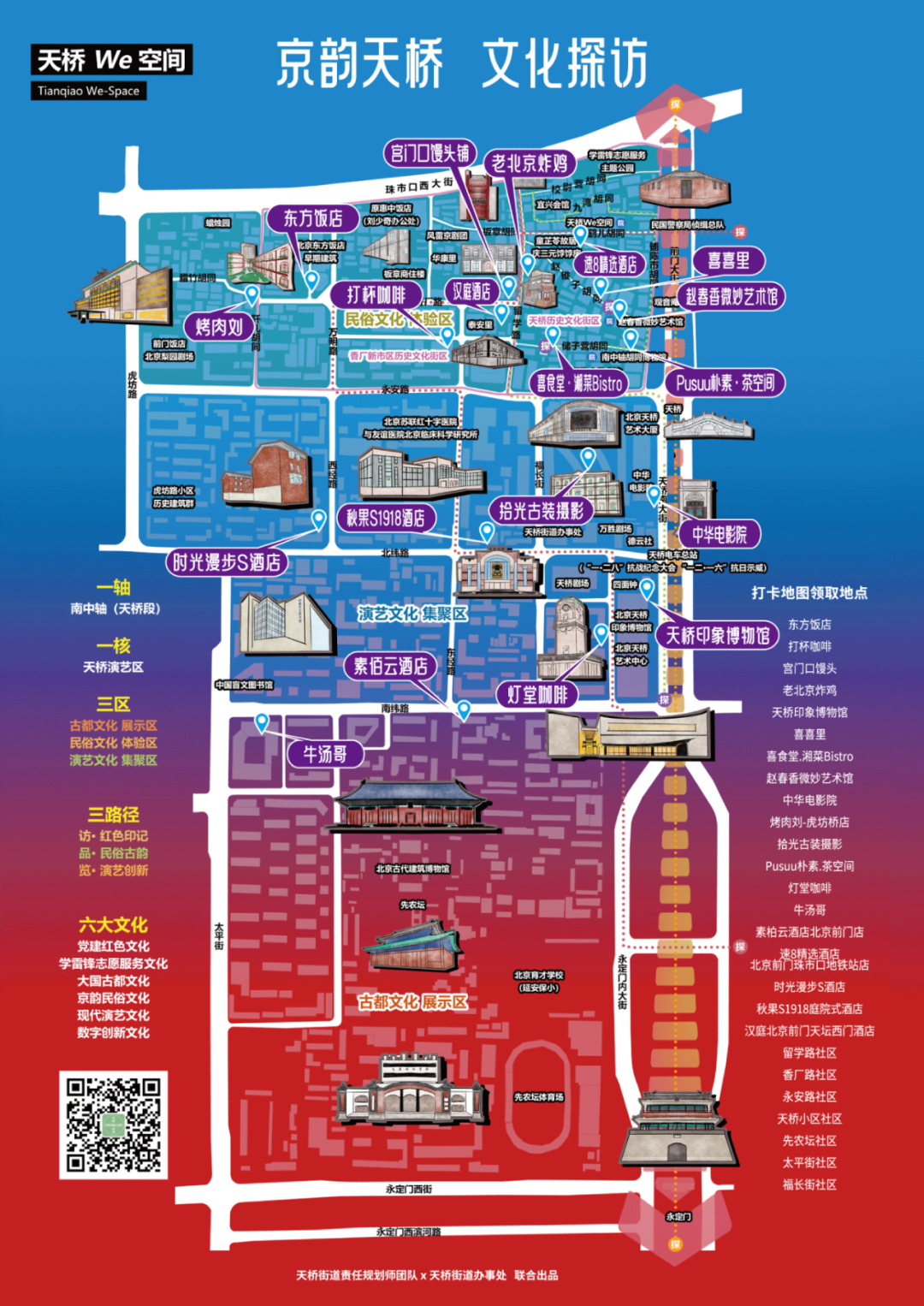 牛汤哥、打杯咖啡、烤肉刘、宫门口馒头、东方饭店、老北京炸鸡、喜食堂·湘菜Bistro、灯堂咖啡、喜喜里、Pusuu朴素·茶空间、天桥印象博物馆、拾光古装摄影、中华电影院等13个点位。
