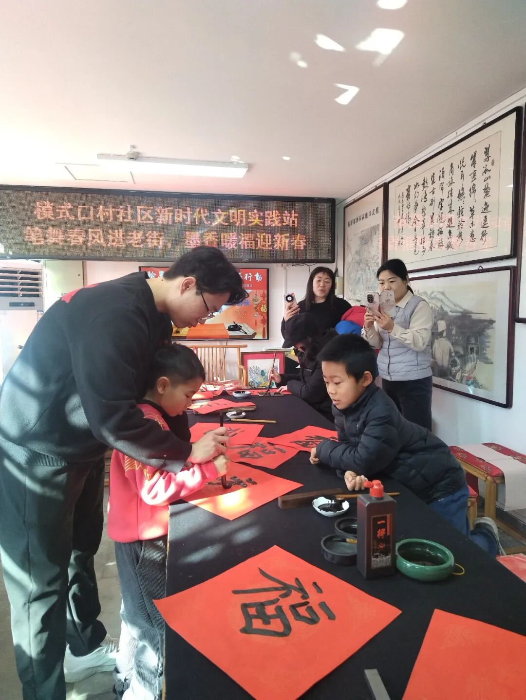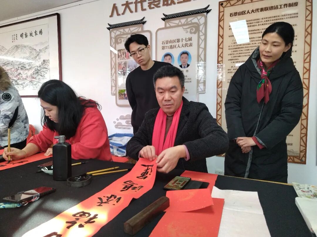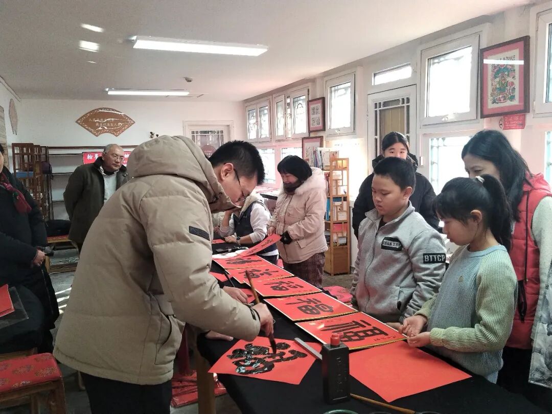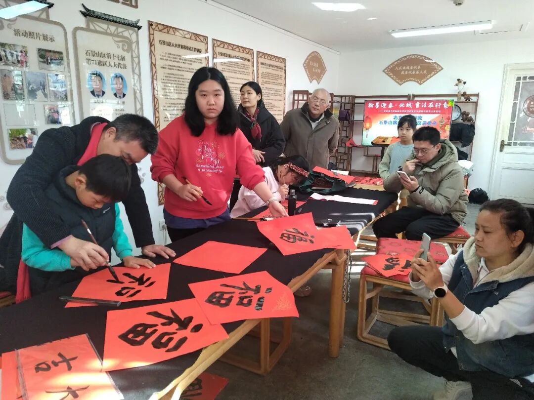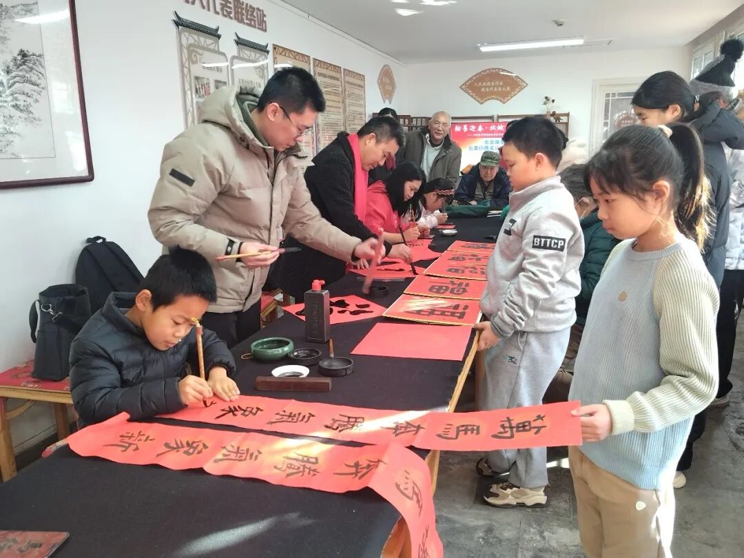 活动尚未开始,工作室就已热闹起来。老街坊们带着对新春的期盼早早到场,孩子们更是好奇地围在书法创作区,期待着见证笔墨生花的奇妙时刻。北京城市学院书法系的师生们刚一落座,就被大家的热情包围——“老师,我想要一副‘春回大地千山秀,福降人间万户欢’!”“能不能给孩子写个喜庆点的福字?”大家你一言我一语,诉说着对新年的美好期许。