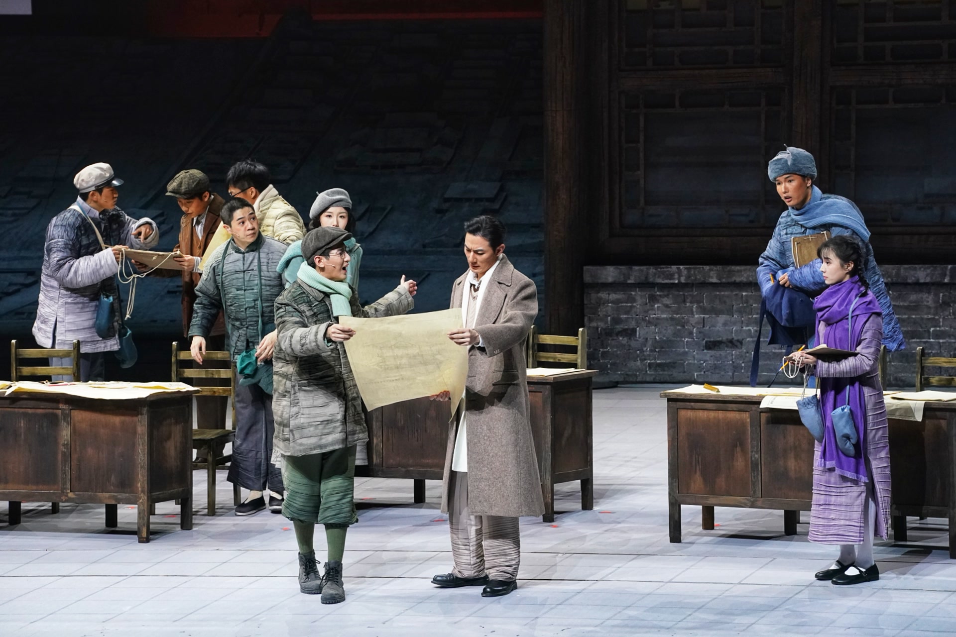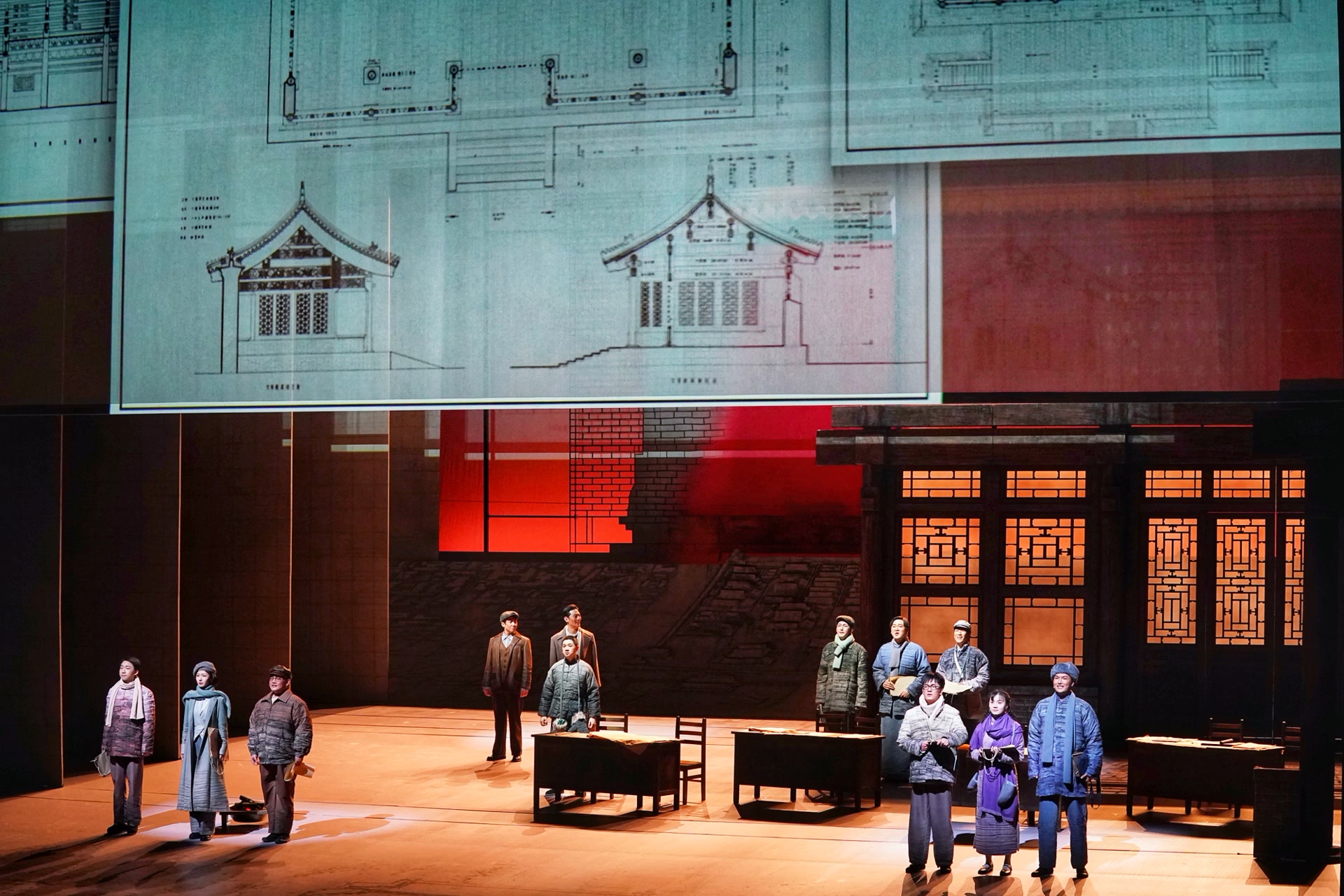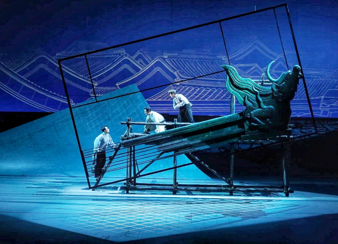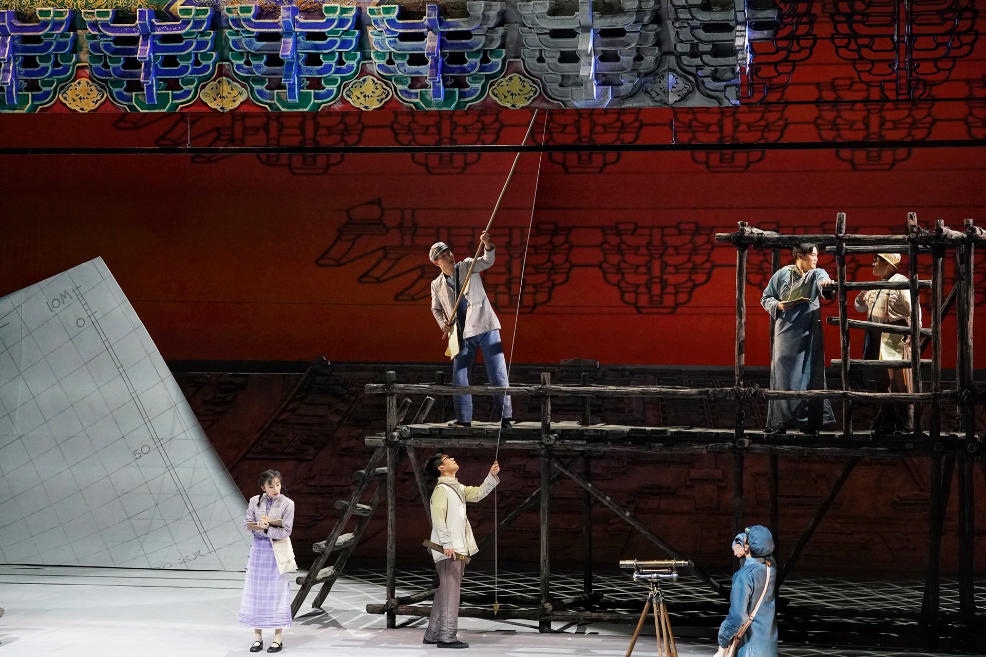 王琛透露,舞台上关键的古建筑构件均严格按照1:1的真实比例复原制作,当它们悬置于观众面前,一种视觉上的“压迫感”油然而生,“观众能直观体会到剧中人物每日工作的物理尺度和精神重量,体会测绘队员是以怎样的血肉之躯攀爬、丈量并试图挽留这份巍峨的文明。”舞台地面,北平时期中轴线的建筑脉络化为起伏线条,如纸张般弧形掀起,“寓意着古城文明在战火中飘摇欲飞却又根基深植的命运。建筑的‘实’代表文明遗产,图纸的‘虚’代表传承意志,虚实明暗的衔接过渡,共同凝固了那段惊心动魄的历史。”