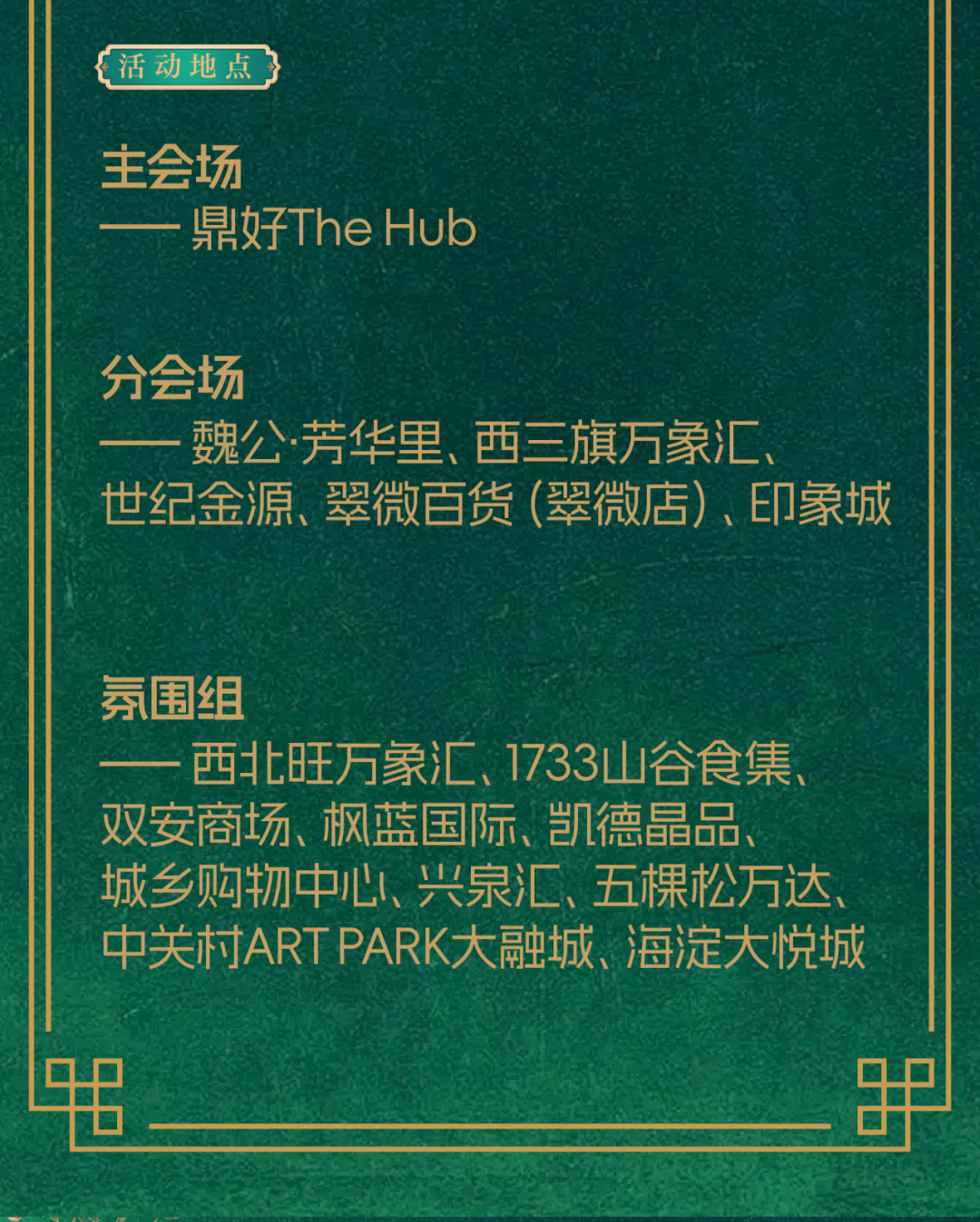 分会场:魏公·芳华里、西三旗万象汇、世纪金源、翠微百货(翠微店)、印象城