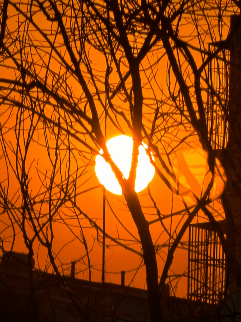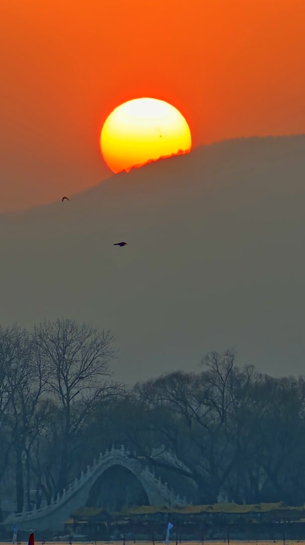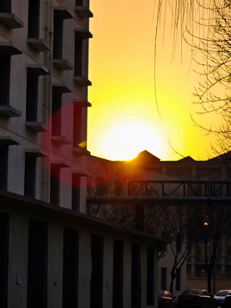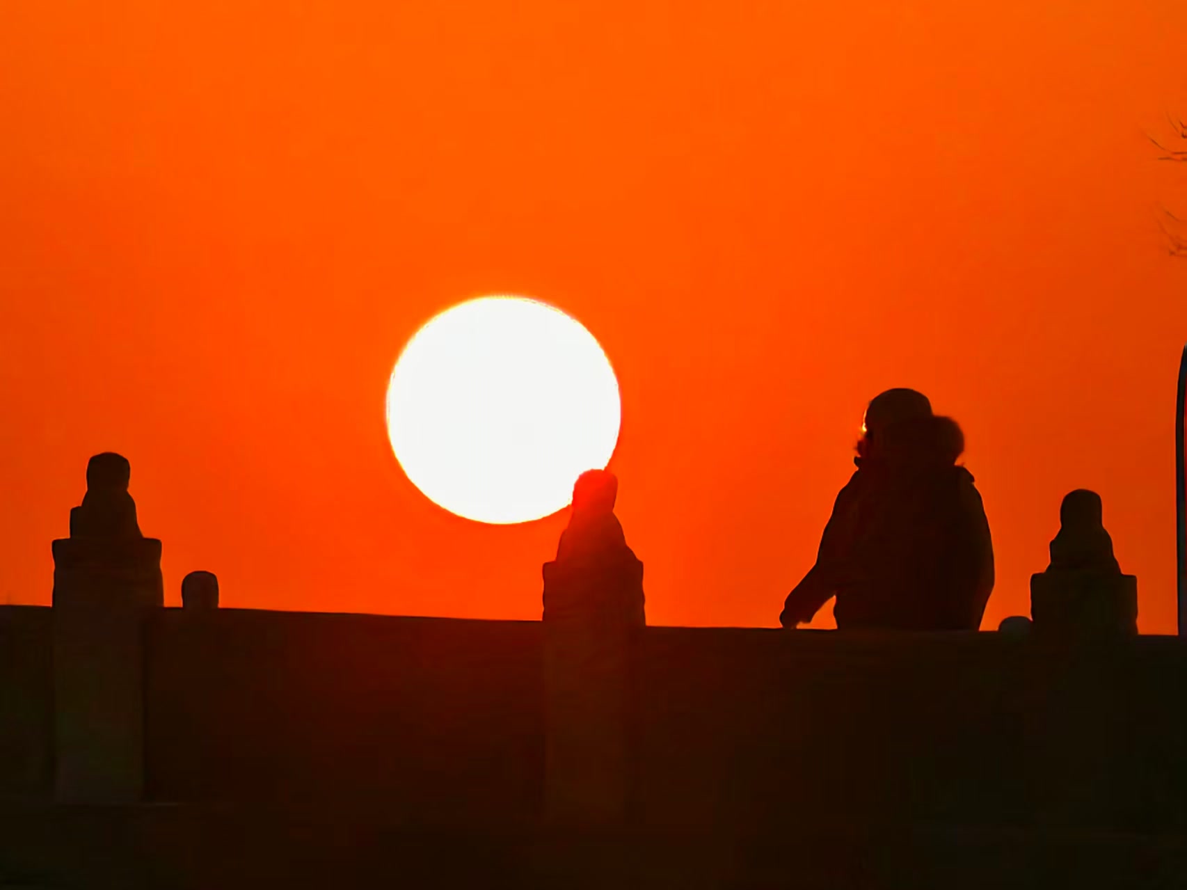 2月4日,北京,傍晚时分,那轮火红的大太阳似巨盘,缓缓下沉,将天际染得如梦似幻。