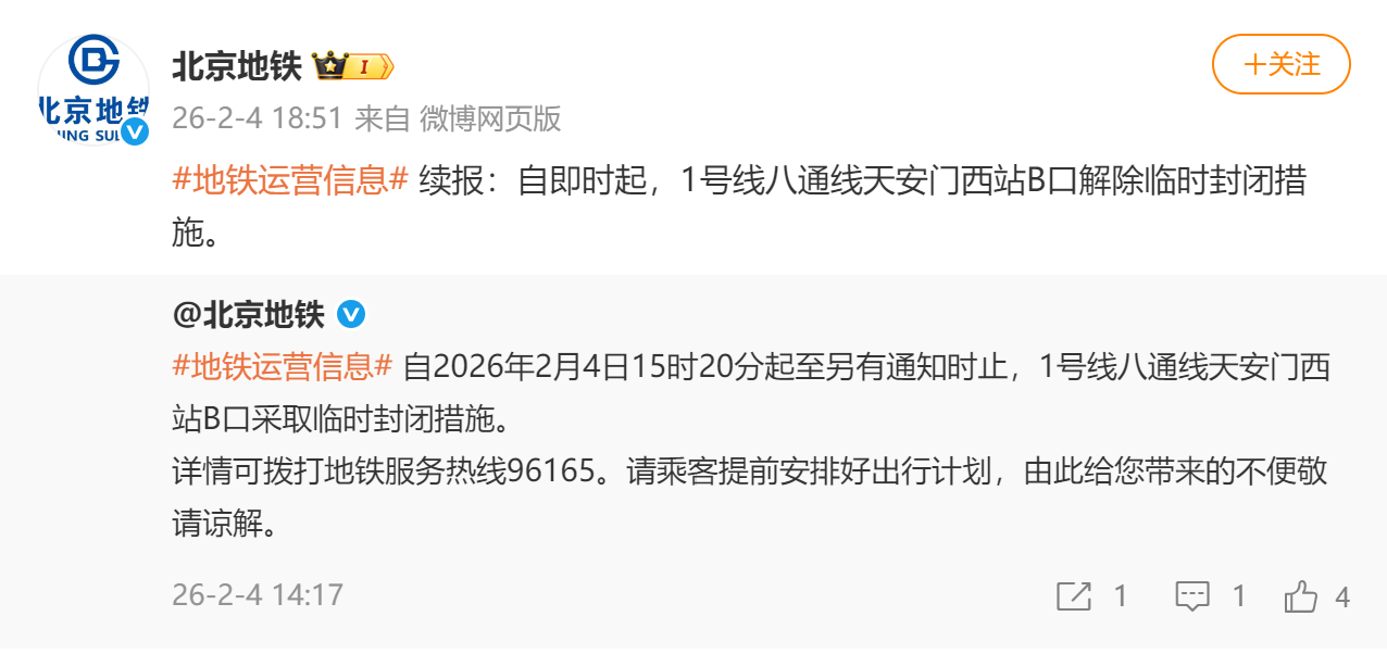 自即时起,1号线八通线天安门西站B口解除临时封闭措施。