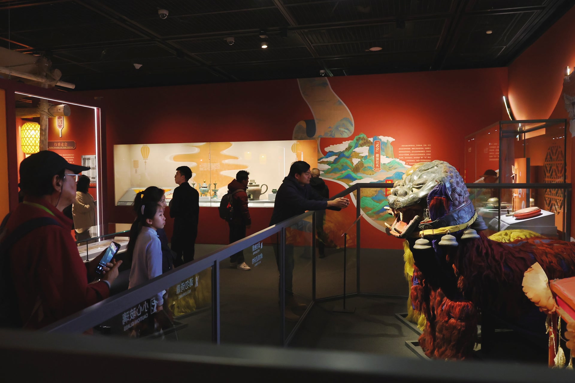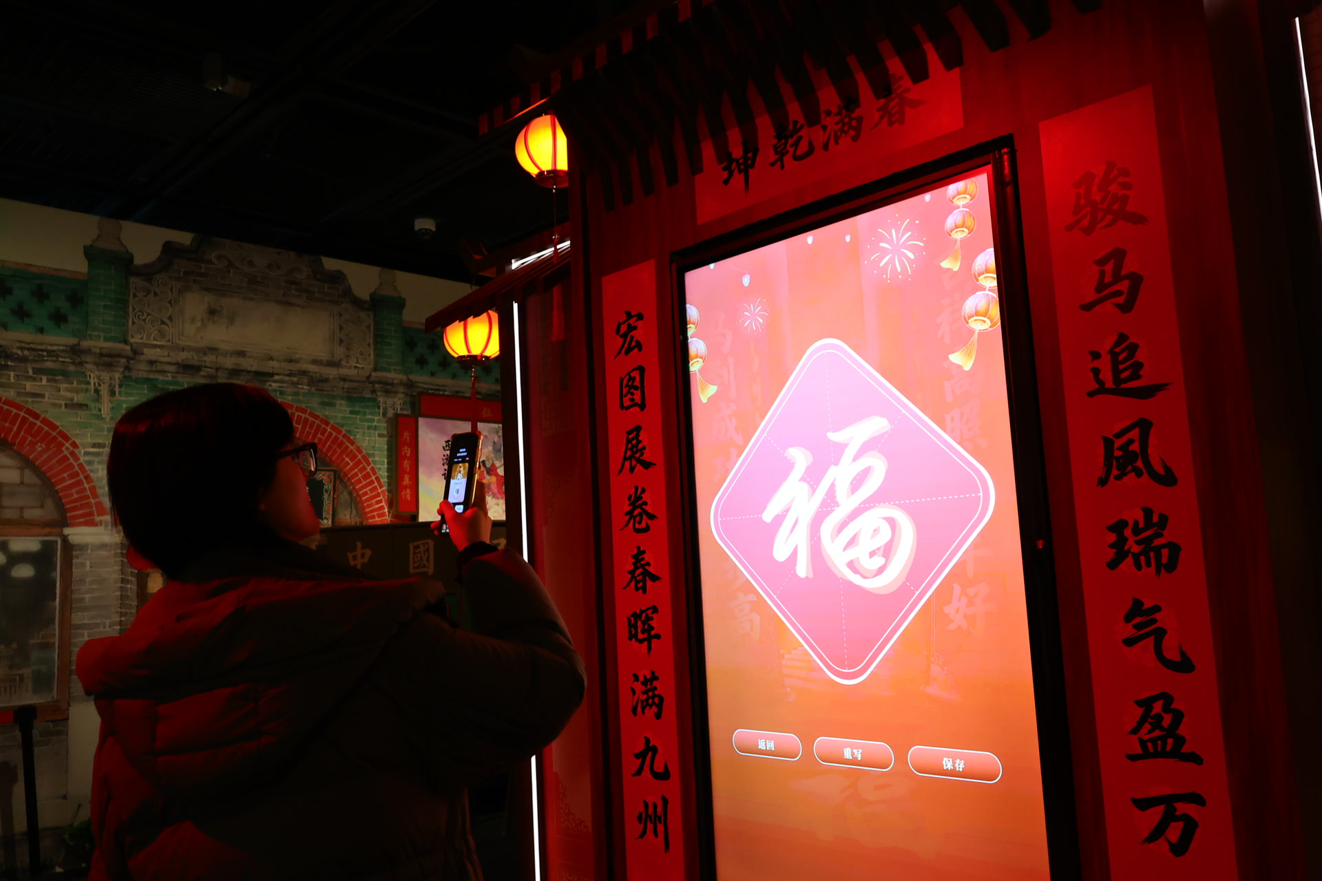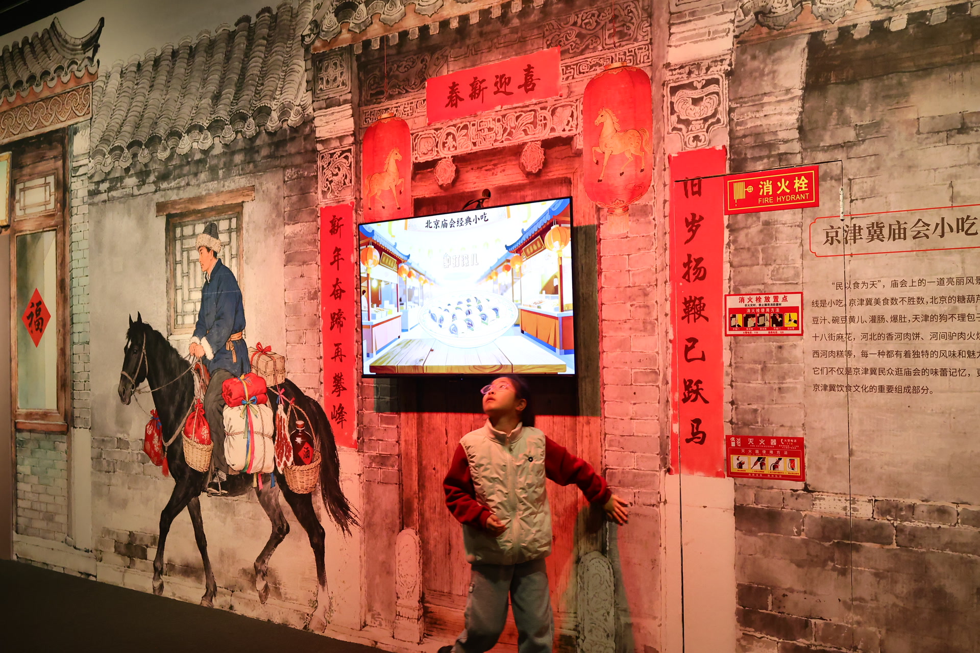 一对情侣在互动大屏上写下“福”字、一位母亲带着孩子体验拉洋片……首都博物馆“幡鼓动幽燕——京津冀庙会文化展”吸引许多游客驻足参观。