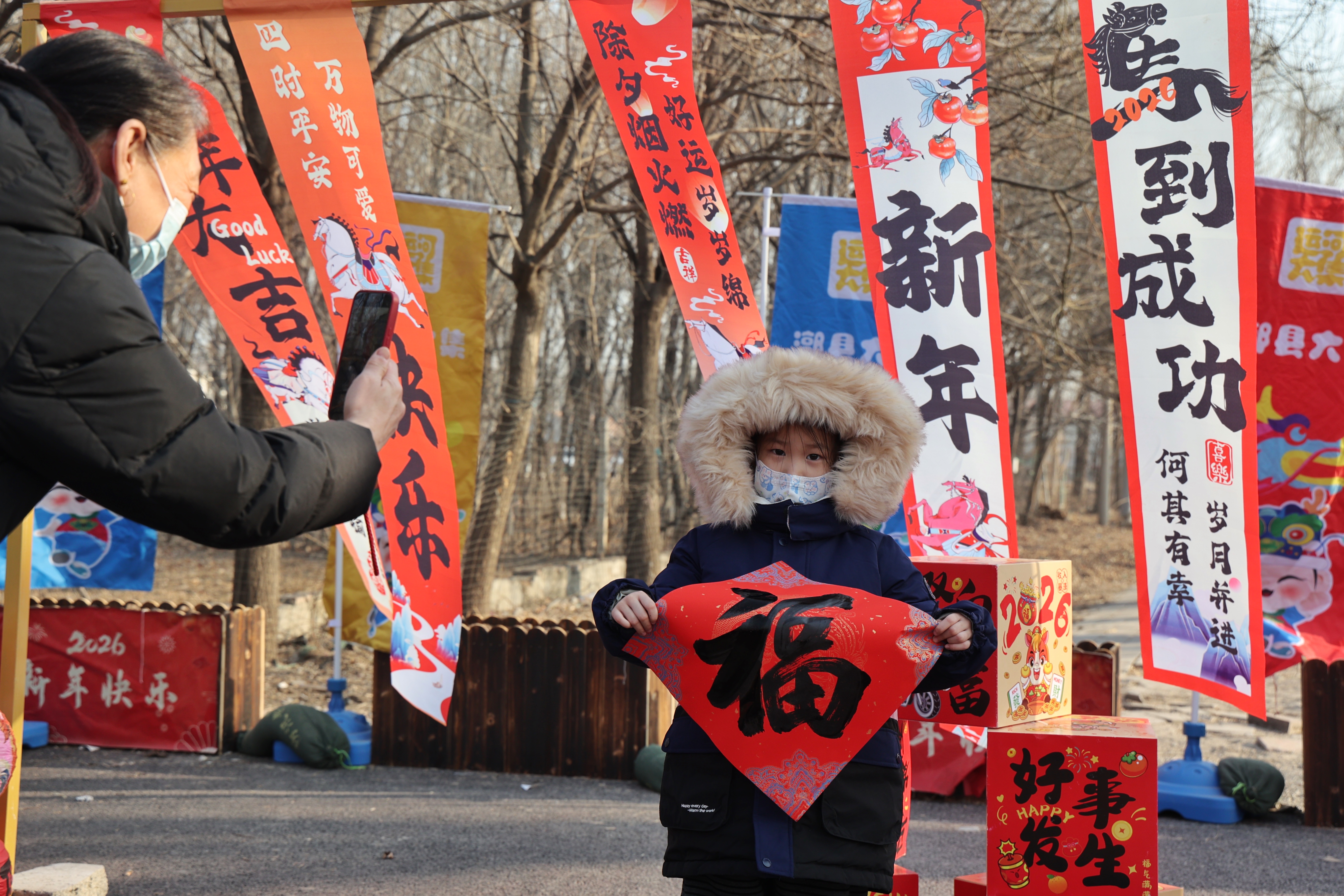 往西看,长达百米的“年货长廊”里,山西老陈醋、赣南脐橙、京津冀特色农产品等年货琳琅满目。“比超市便宜!芹菜3块钱一大棵,橙子10块钱5斤。”家住通州城区的李女士拉着小推车,一边挑拣富硒鸡蛋一边笑着说。旁边的大集美食街上,非遗纪各庄豆腐、现做山东煎饼、通州特产咯吱盒香气扑鼻,小孩们举着地瓜串、糖葫芦、炸鸡架,笑个不停。