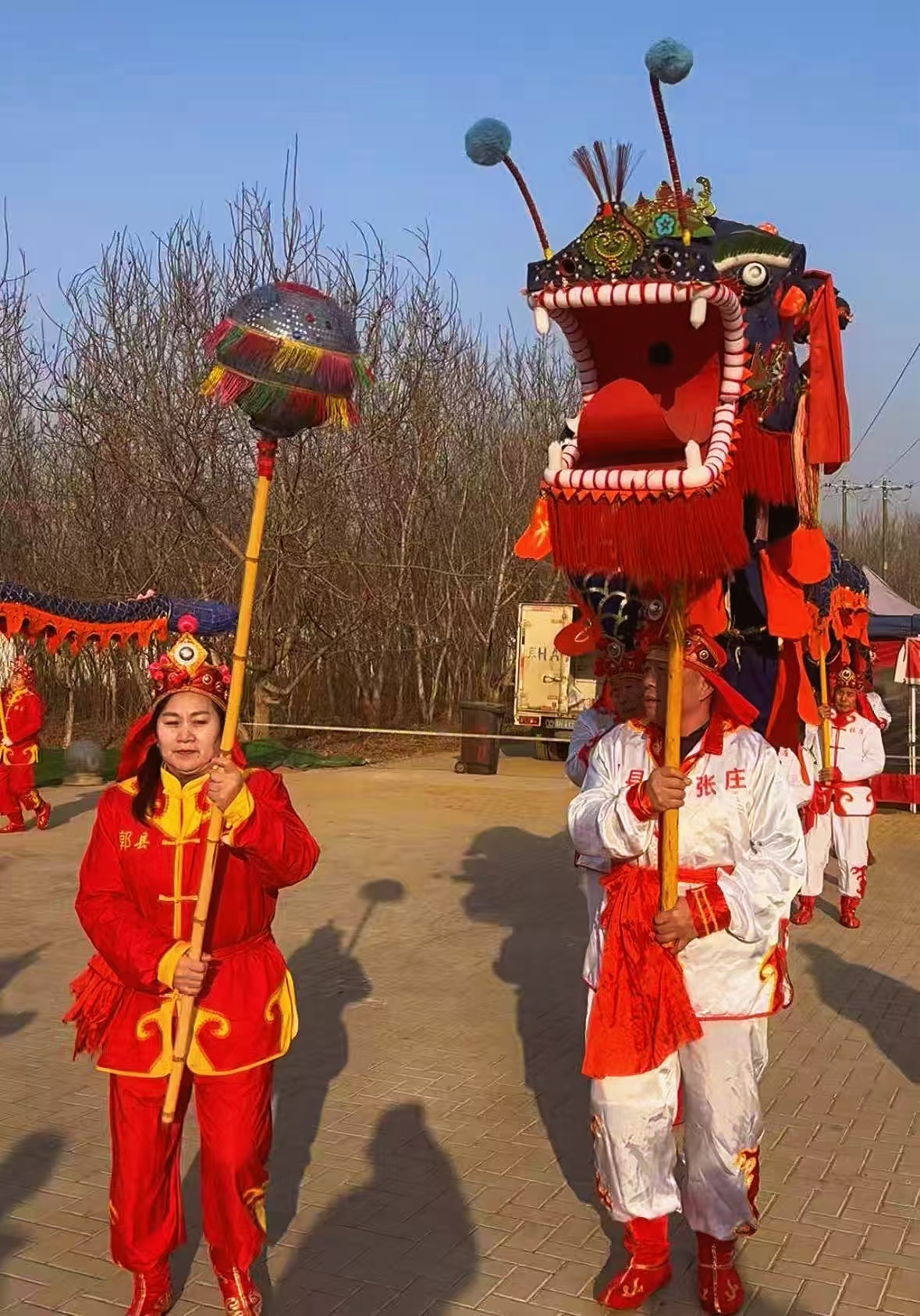 漷县紧邻千年大运河,水绕城郭,因而得名。上午9时许,当记者抵达漷县大集南入口时,立刻被现场的锣鼓声吸引。两条长18米的蓝色巨龙,在“运河龙灯会”队员们手中上下翻飞,观众围了一层又一层,很多家长把孩子扛在肩膀上观看。漷县镇张庄村“运河龙灯会”作为市级非物质文化遗产,传承已近200年。