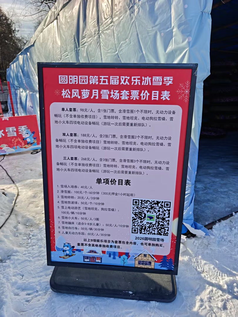 圆明园的雪场有98元的单人通票,同时也提供40元的入场券,陪玩的家长可以只买入场券入场。在玩通票项目时,工作人员会在小票上打个标记,这样也能区别通票和门票的权限。