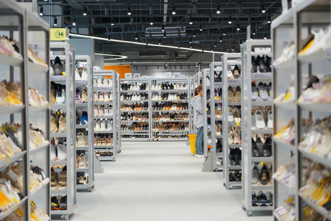 走进荟品仓,第一感受就是大!面积超过1万平方米,空间被分成2层,主要卖场都聚集在2层,开阔通透、分区清晰,满满的工业风,店内采用开放式仓储布局与无导购自助模式,所有商品明码标价,从男女鞋服、轻奢包到美妆护肤,品类很是丰富。
