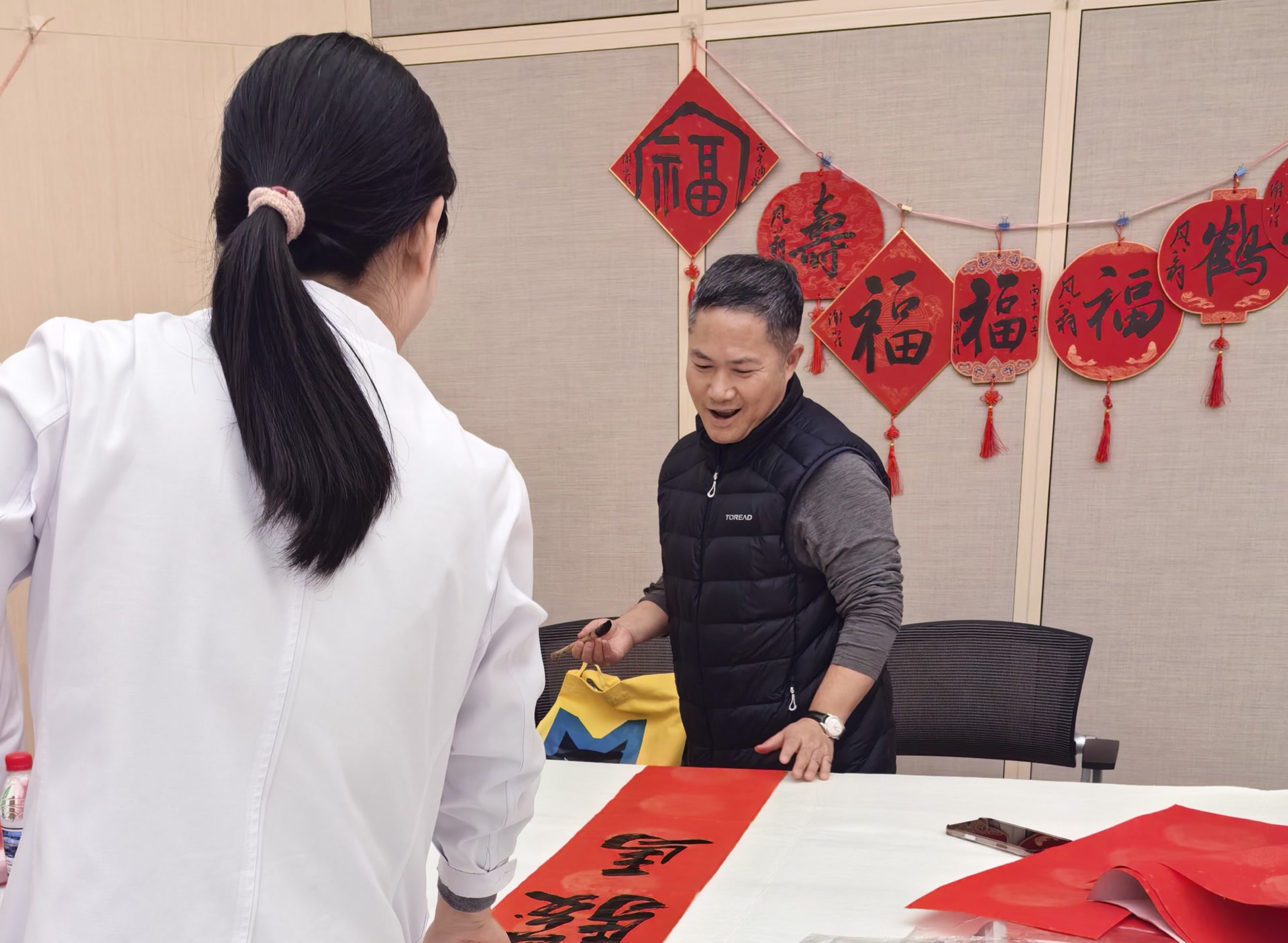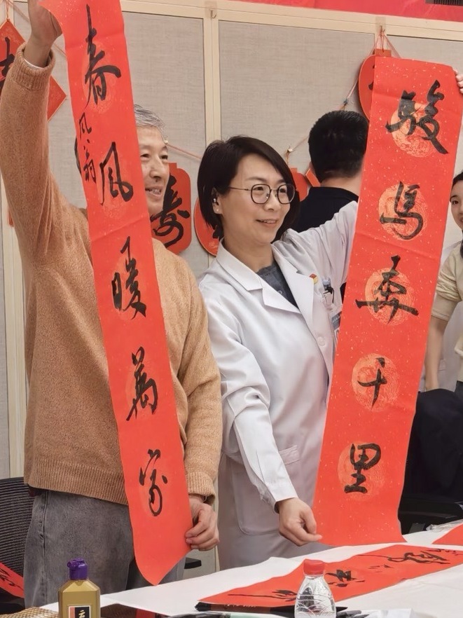 书画艺术家们现场倾情创作了近一个小时,医务工作者们驻足观赏,墨香与欢笑交织,暖意与感动相伴。本次活动共计创作并赠送春联、“福”字等书画作品百余幅,这些红色的祝福让全院医务工作者感受到了来自社会各界的关怀与敬意,这份温暖将转化为坚守岗位、履职尽责的强大动力。