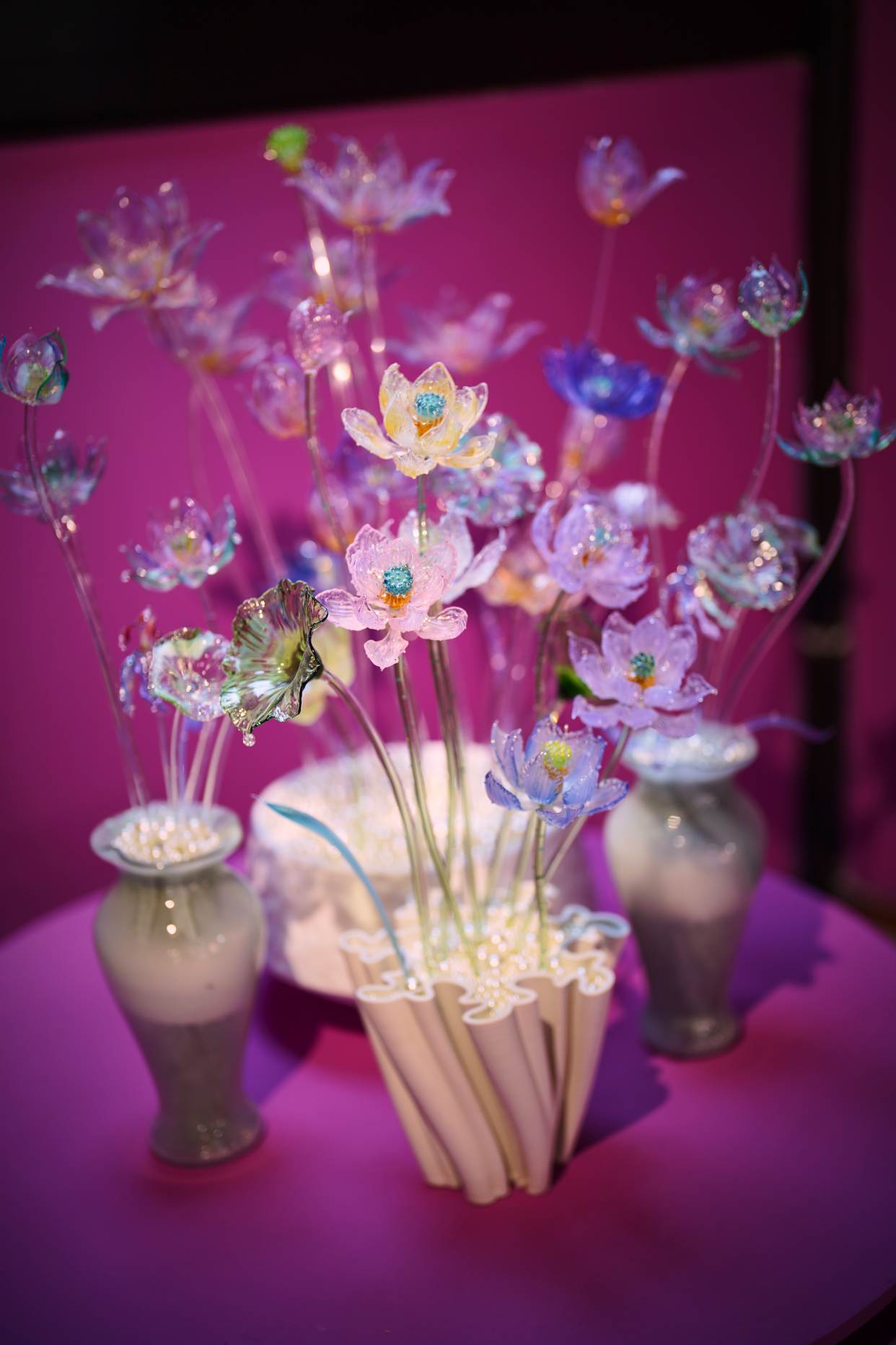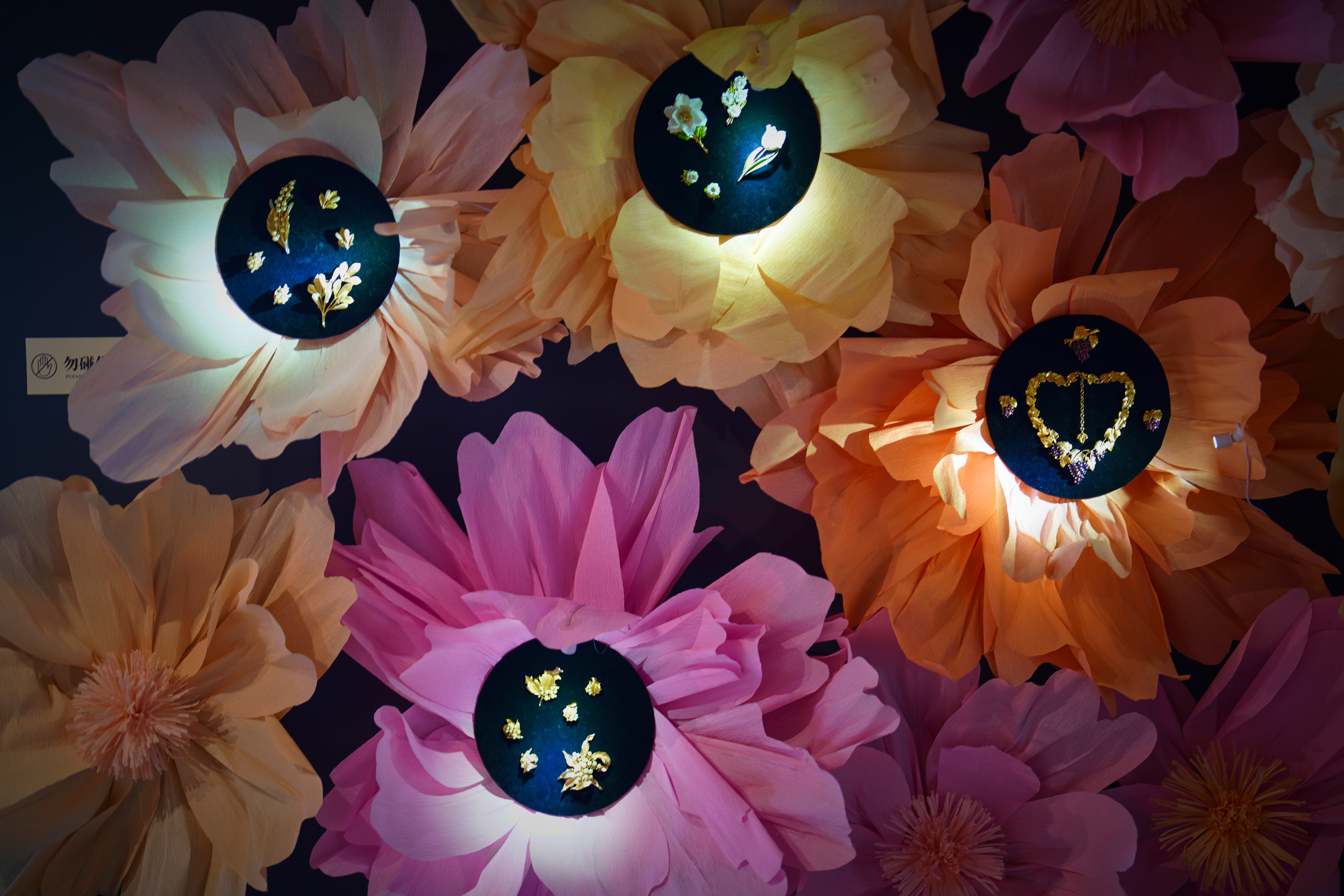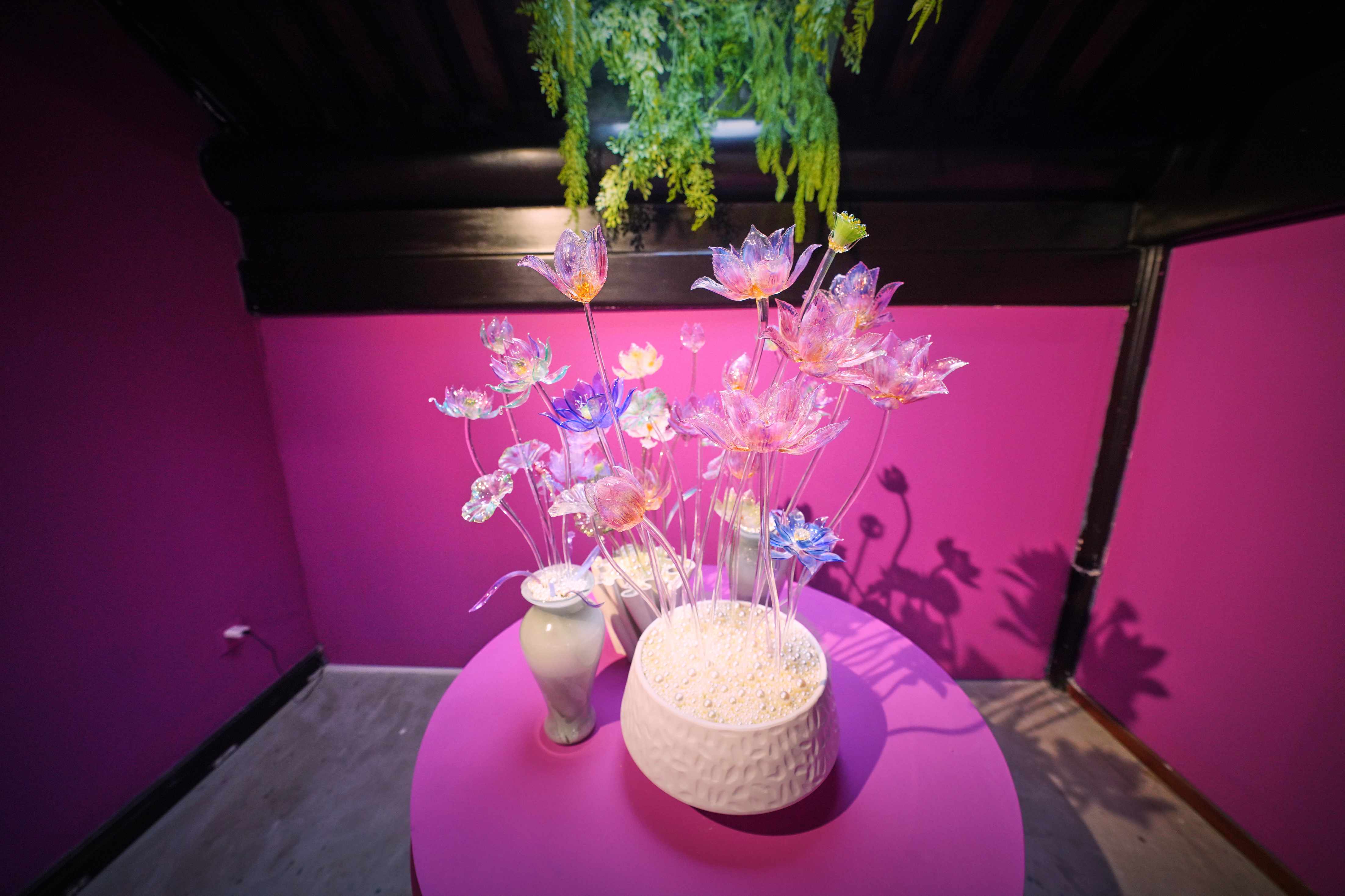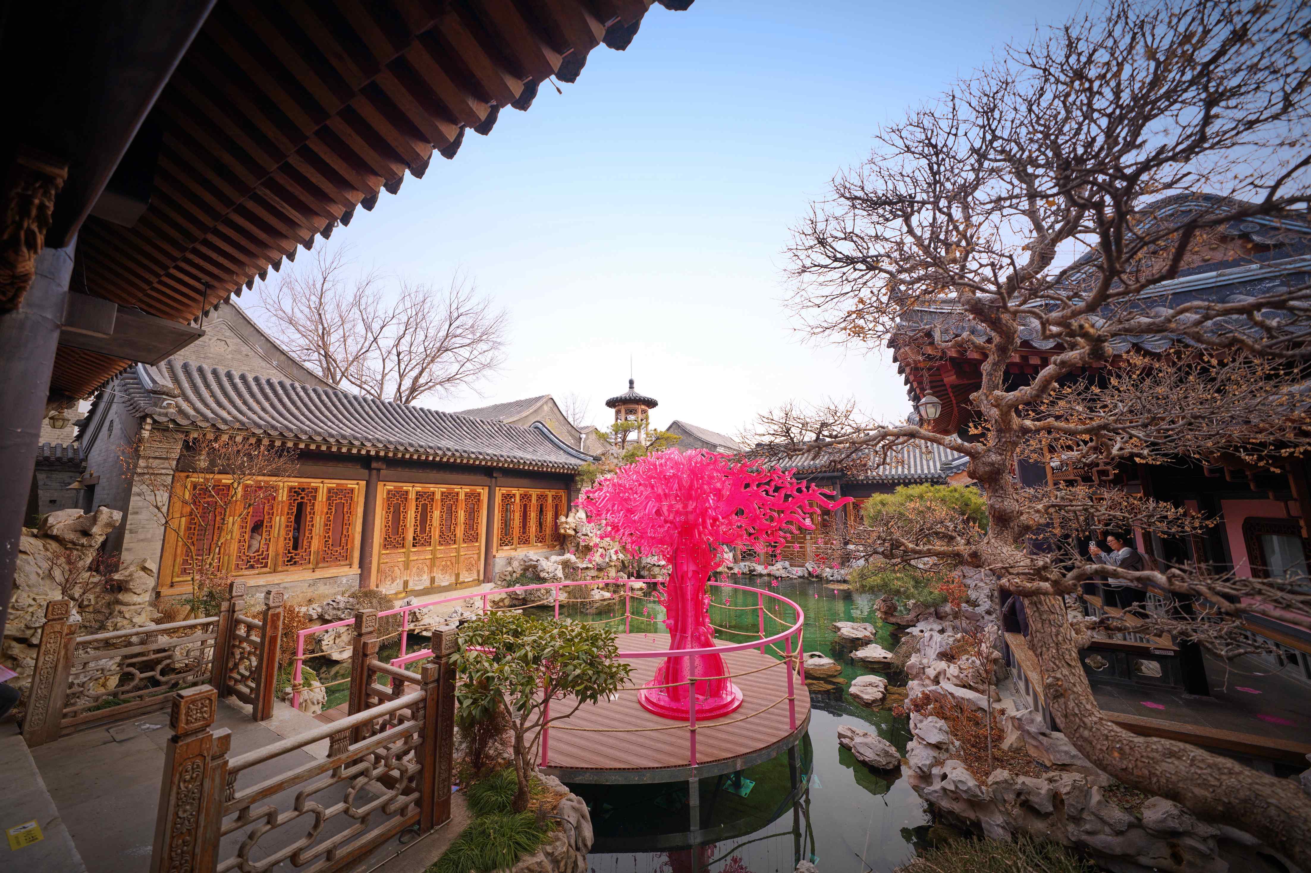 信步展馆,粉色背景墙与庭院光影交织成趣,巨型亚克力桃花树立于清池之上,悬挂的花艺装置随光线流转生姿,每一处皆藏着中式美学的细腻肌理与蓬勃生机。
