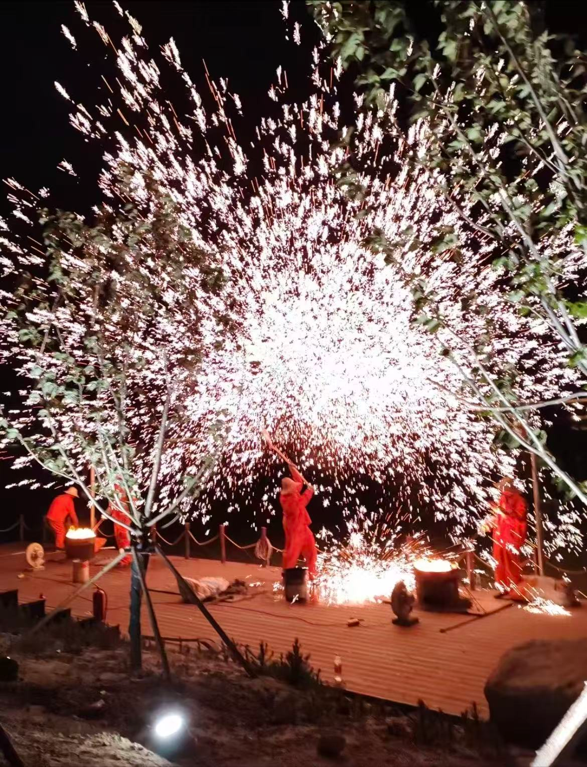 数十组主题灯组次第点亮,将传统马年元素与现代光影技术完美结合,流光溢彩间尽显新春喜庆;非遗打铁花惊艳亮相,炽热铁水凌空绽放,再现“火树银花不夜天”的盛景,让市民近距离感受非遗魅力。