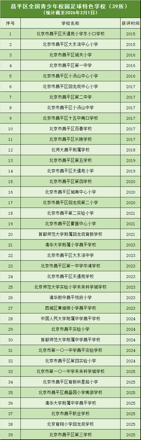 自2015年以来,昌平区已累计创建39所全国青少年校园足球特色学校。作为全国青少年足球人才培养改革试点区,我区坚持深耕细作、精准施策,持续发挥示范引领作用,积极推动校园足球整体提质、资源共享与区域协同。