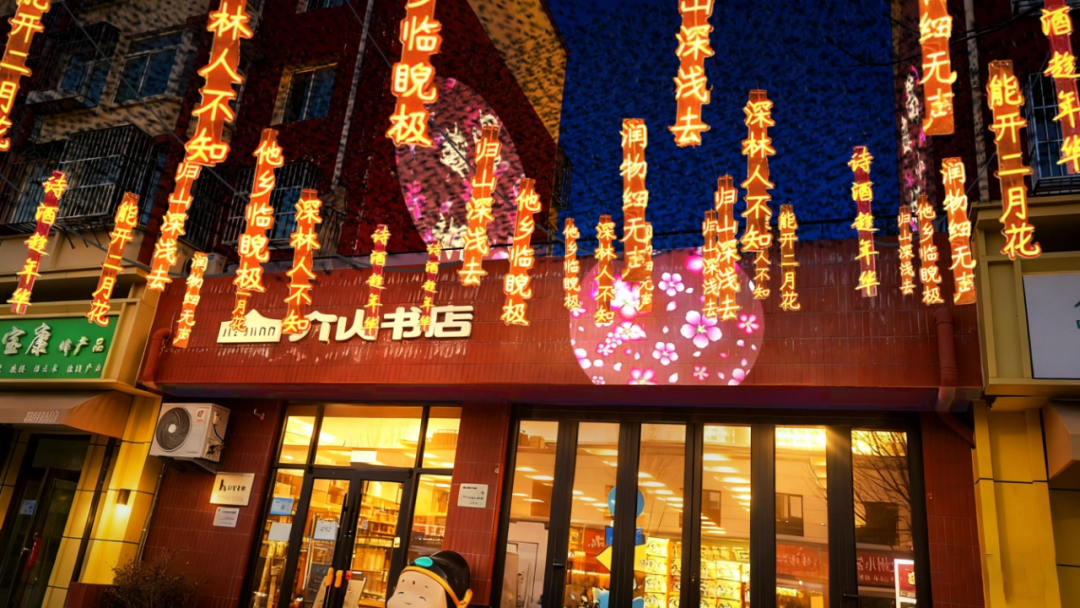 作为昌盛小街的起始点,一进入西口被立体化灯饰包围的“昌盛小街”四个发光字格外显眼,介山书店周边的“文化溯源区”更是亮化核心点位,低饱和度暖光勾勒街巷肌理,融入山体轮廓光影与文化符号。书店门前的国风古诗词挂灯氛围感拉满,“润物细无声”“诗酒趁年华”等佳句在灯光下徐徐展开,与周边景致相映成趣,国风雅致与新春喜庆完美融合。“美食寻味区”作为小街烟火核心区,则聚焦“深夜食堂”特色,树挂以暖调点线光交织,营造出美食与光影交融的市井烟火氛围;“文化墙区域”设置柔和漫光,让烟火气与暖光相互映衬。这场兼具文化底蕴与视觉冲击力的新春光影盛宴,等您打卡,包出片!