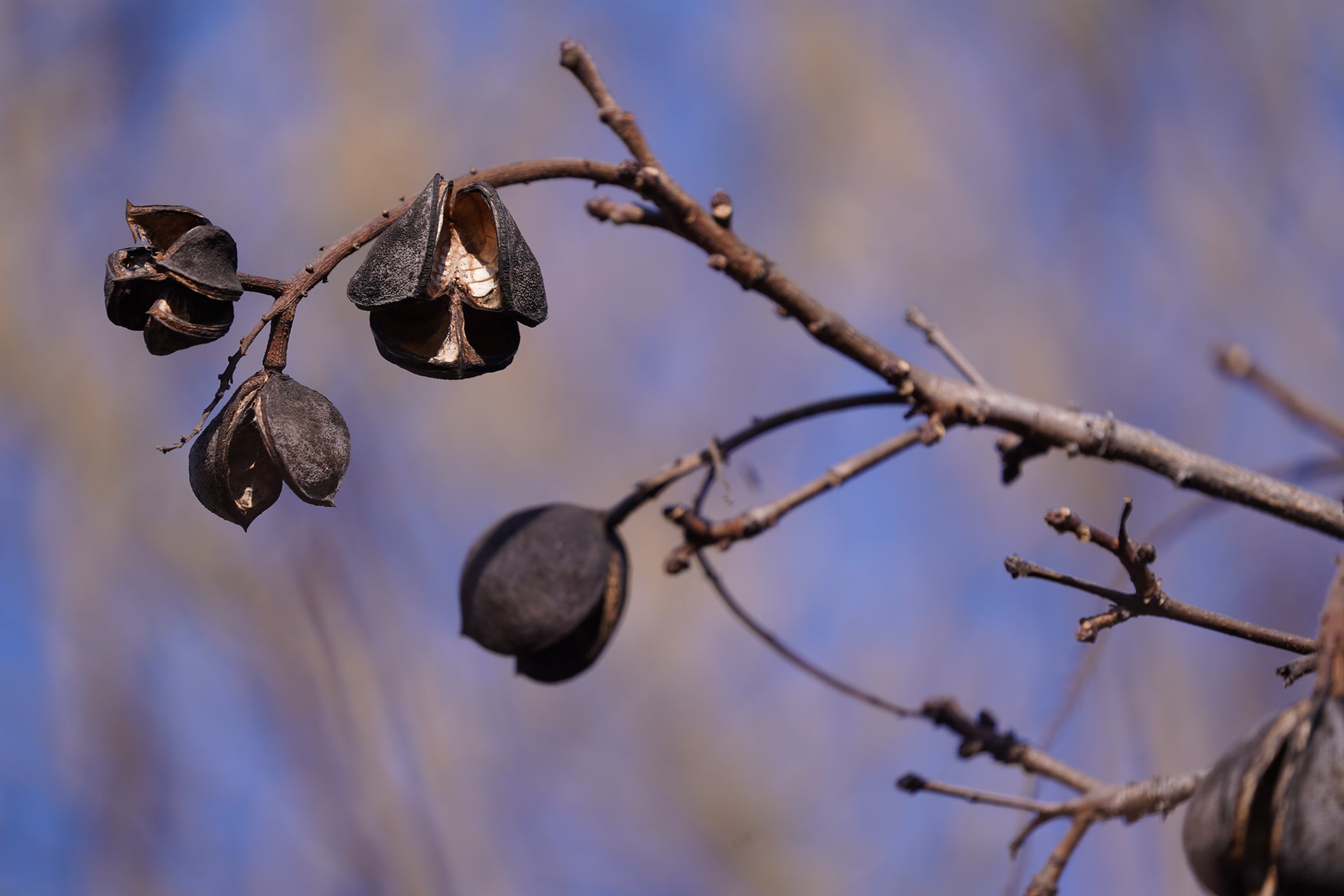 走出家门,真冷,但太阳很足,天很蓝。我抬眼便撞见那株文冠果,静立在冬的萧瑟里。它像熟透风干的核桃,被去年的风敲开了。有的还含着果仁,有的已空空如也,只剩下外壳。啄食的鸟儿,忽地飞走了。
