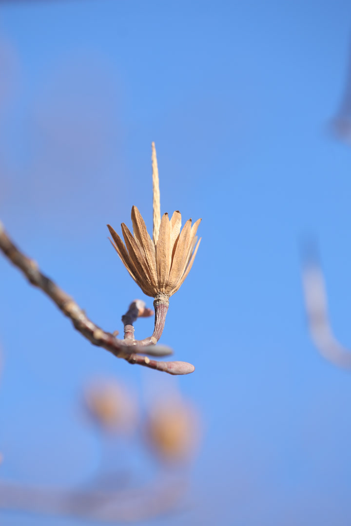 翅果被风吹散全部落光后,仅剩最外面的一圈种鳞环绕着中轴,看起来像花瓣一样,又很像烛台。当冬日的阳光照过来,仰望蓝天下枝头的果实,有点满树“烛台”熠熠闪光的错觉。它的果实在树上停留的时间很长,可达好几个月,有时新叶已经萌发了,甚至已经开花了,仍有果实残留在树枝上。