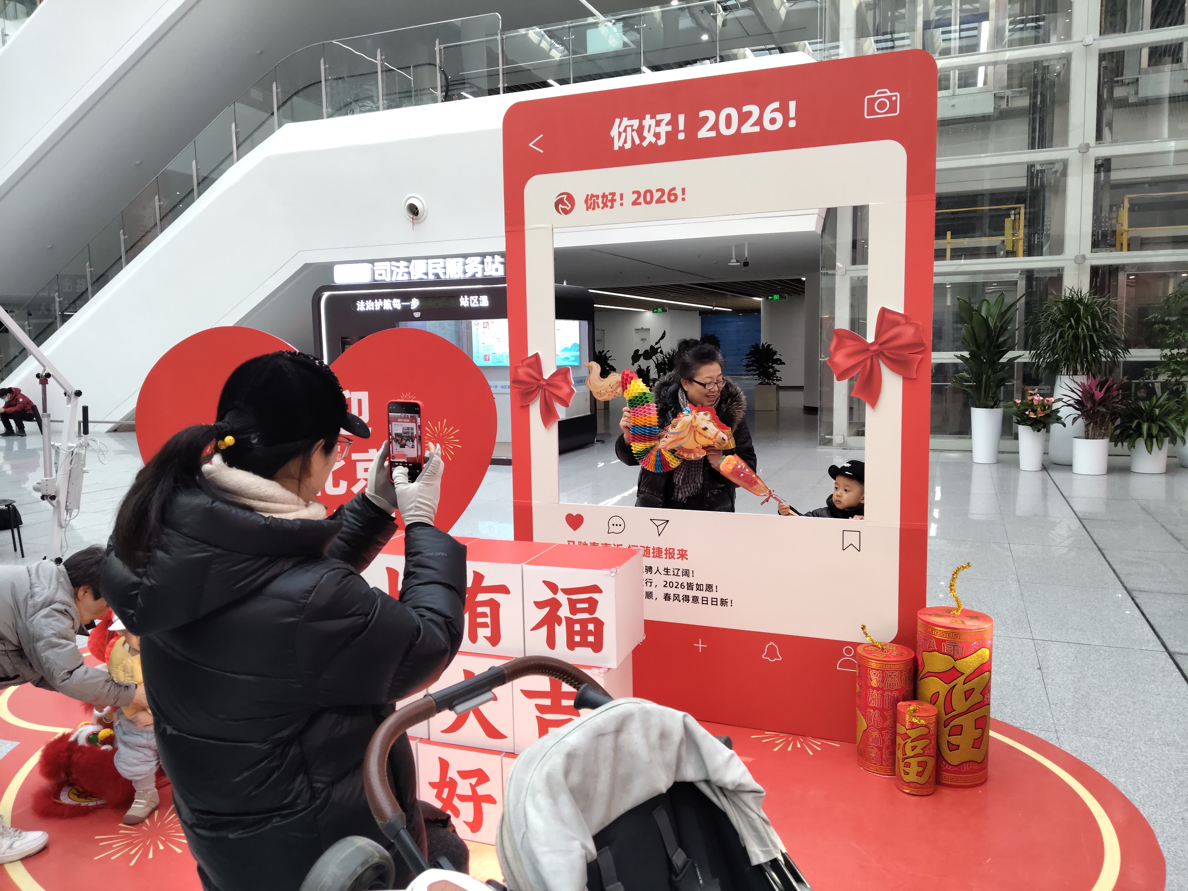 《你好2026·定格马年第一帧》:红金配色的“朋友圈”大型相框,融入爱心装置与吉祥话语,成为旅客合影分享、定格新春笑容的热门点位。