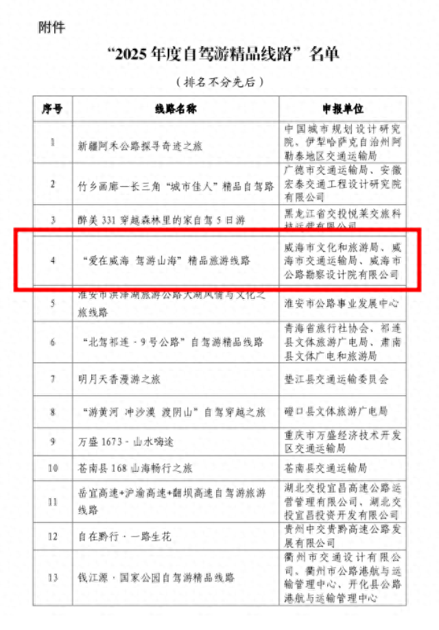 近日,中国公路学会旅游交通工作委员会、中国旅行社协会自驾旅行分会共同公布“2025年度自驾游精品线路”,最终确定20个精品项目。“爱在威海 驾游山海”精品旅游线路成功入选,为全省唯一上榜线路。