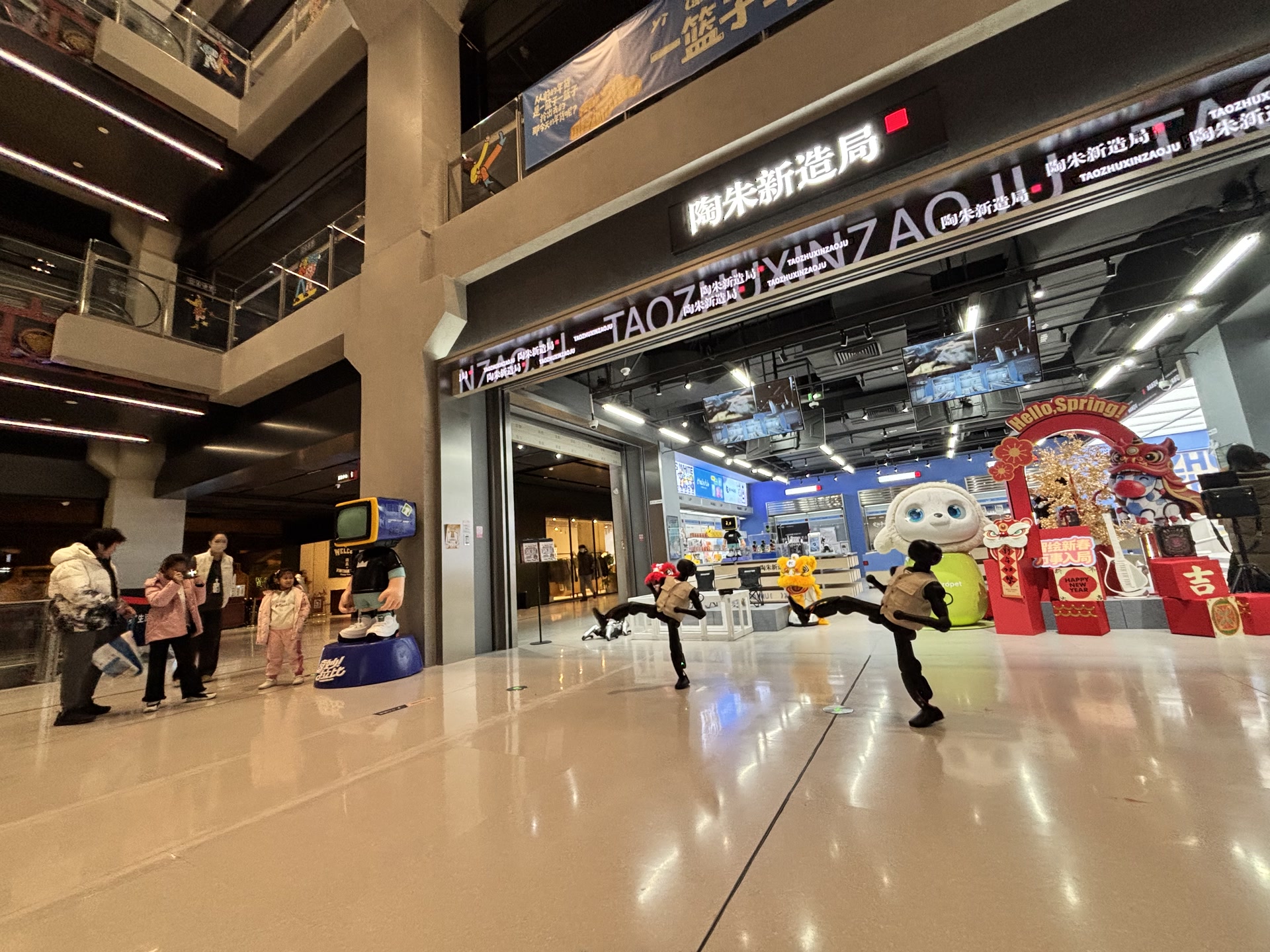 首钢园融石广场里藏着一座“机器人乐园”——全国首家机器人科技体验店“陶朱新造局”。门店前,两台人形机器人秀起了舞步,舞狮和霹雳舞表演有模有样,好几位带娃的顾客立马围了过来,不约而同地拿起手机拍个不停。一旁的机器狗来“抢镜”,先来了个后空翻,又起身对着大家拜年,引来小朋友们阵阵叫好。